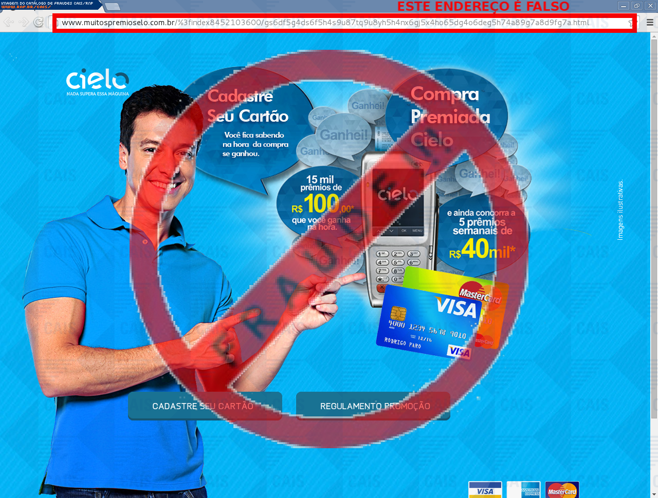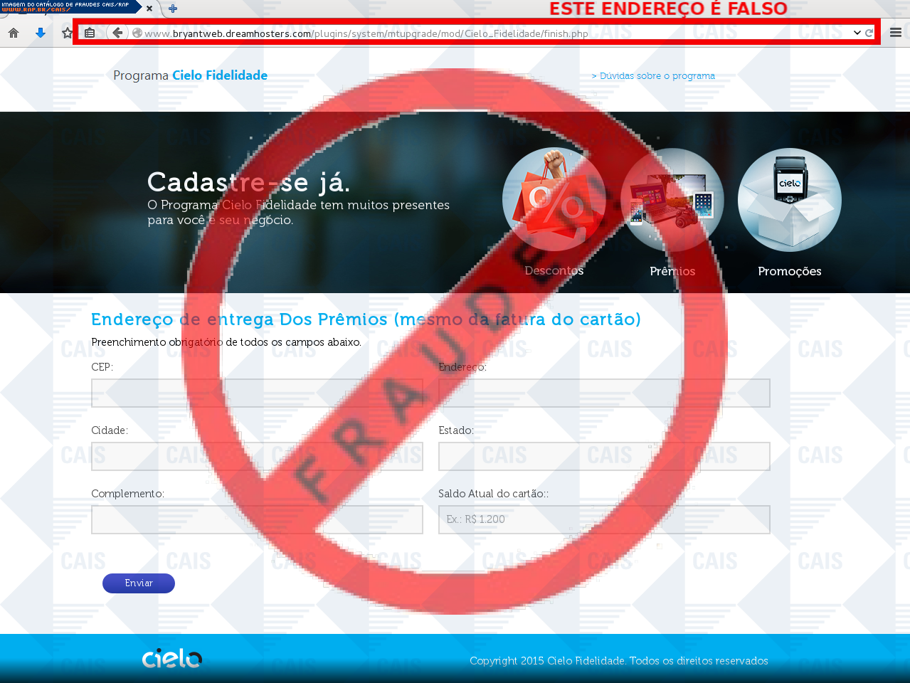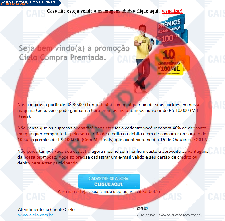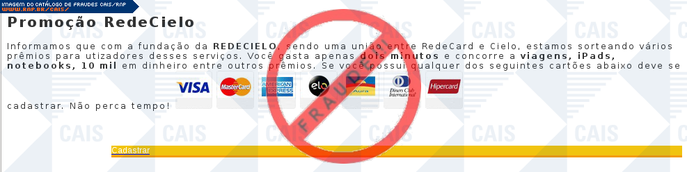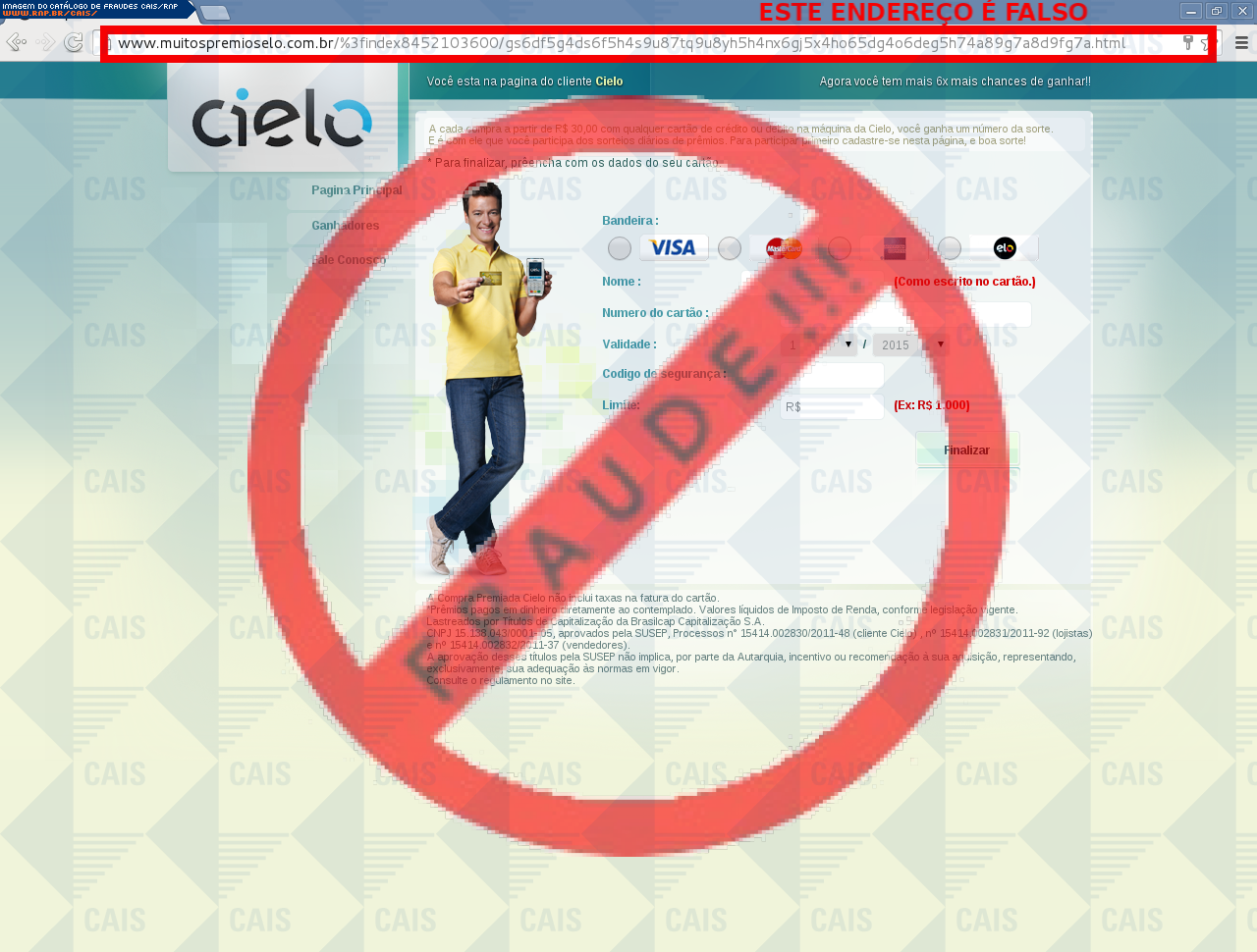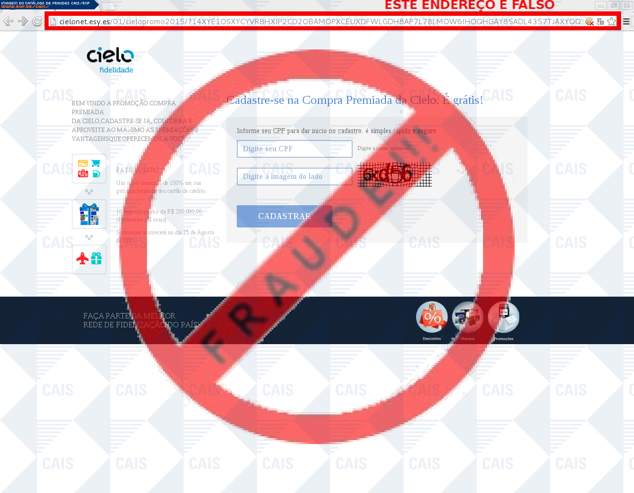| comentário | A vítima recebe um e-mail informando sobre promoções relacionados a seu cartão Cielo sendo necessário realizar um cadastro, no entanto a página é falsa destinada a roubar os dados do cartão de crédito do usuário. | |