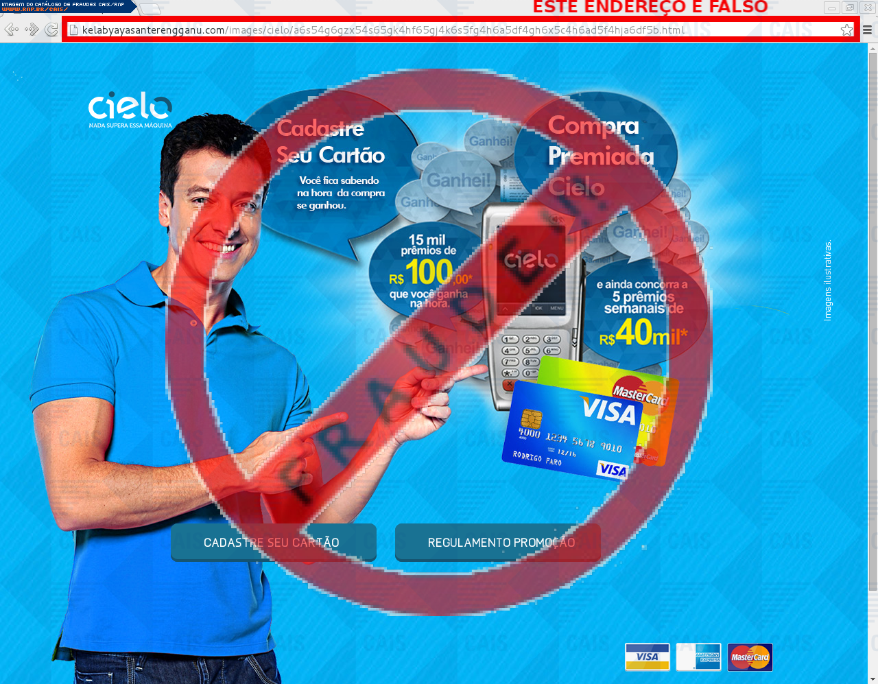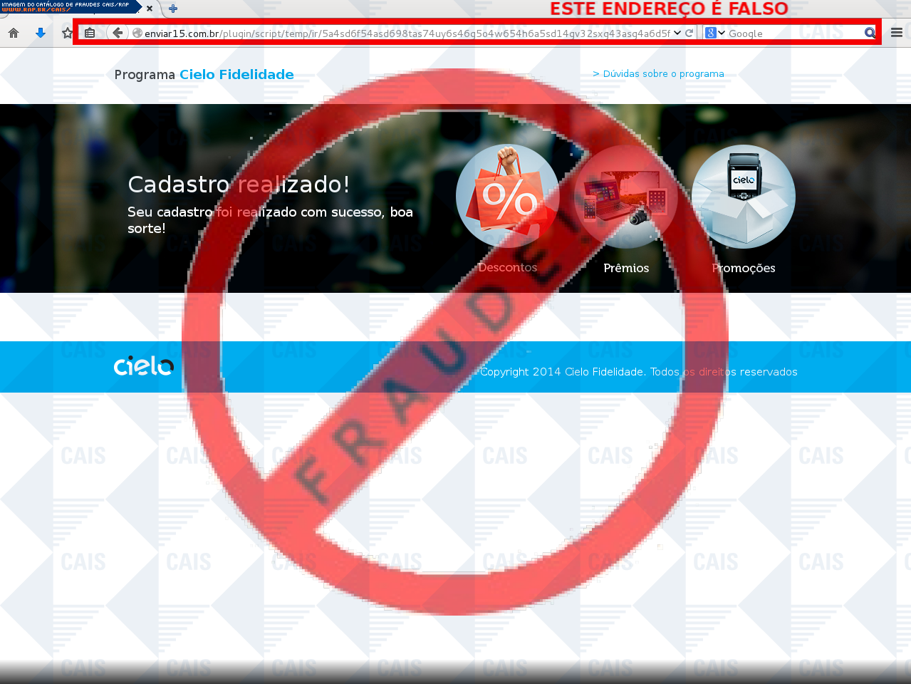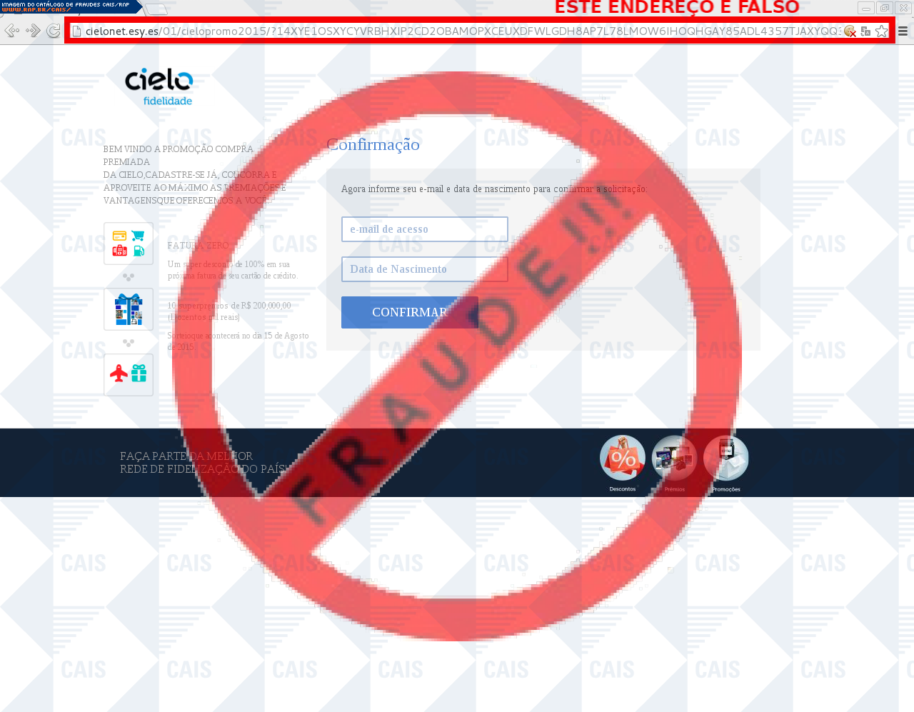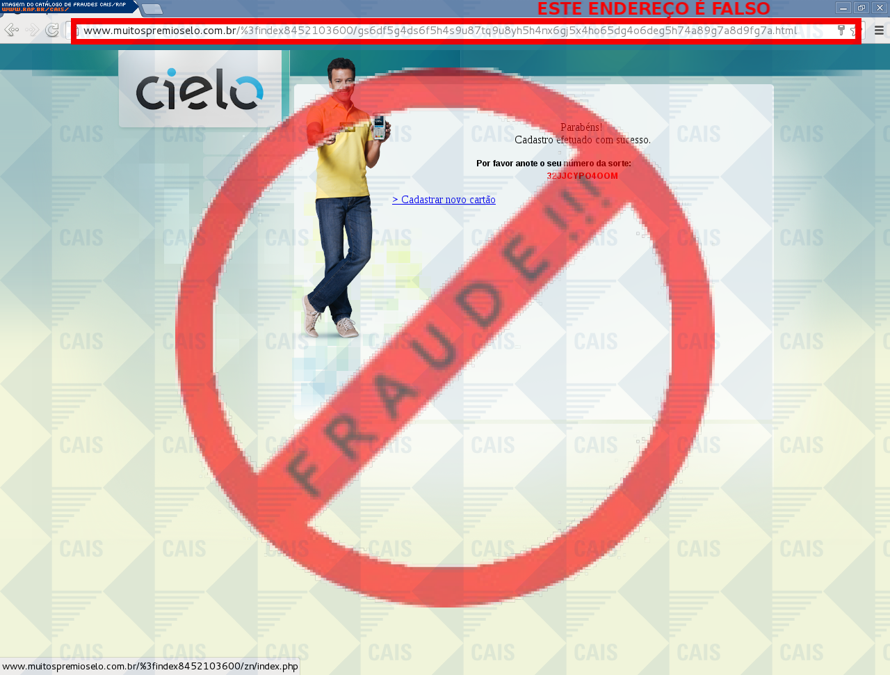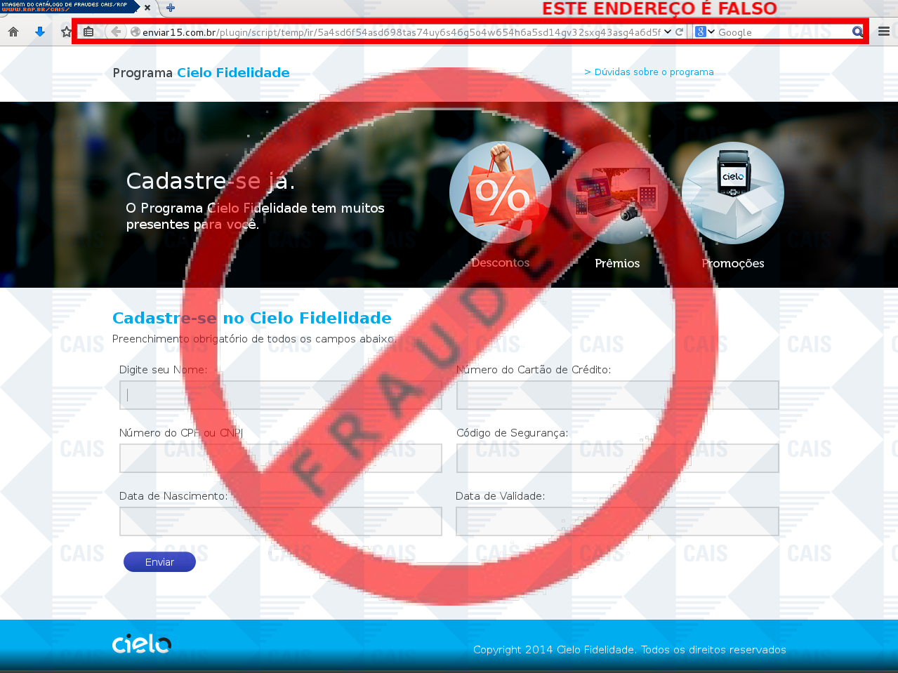 | comentário | A vítima recebe um e-mail informando sobre promoções relacionados a seu cartão Cielo sendo necessário realizar um cadastro, no entanto a página é falsa destinada a roubar os dados do cartão de crédito do usuário. | |