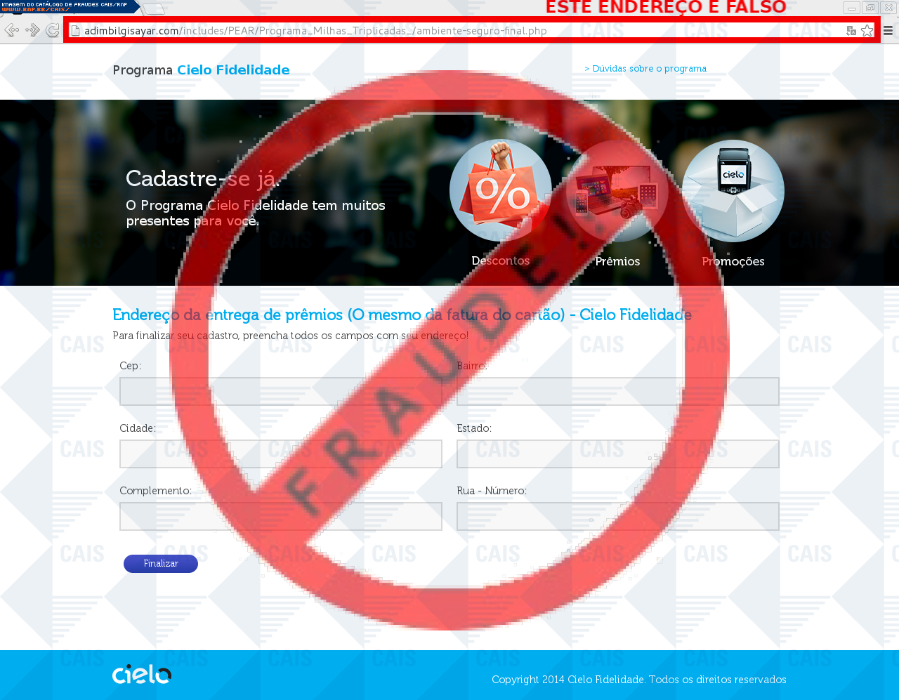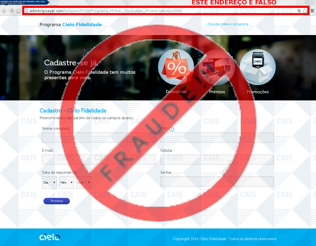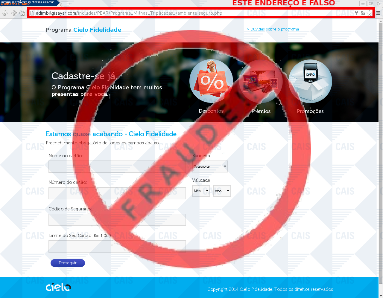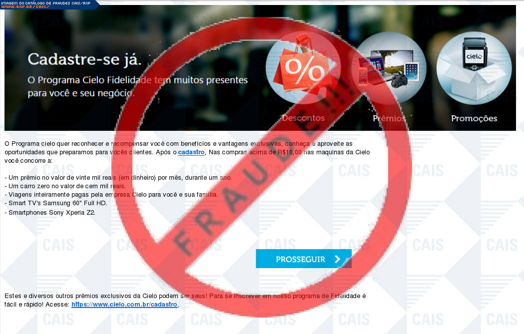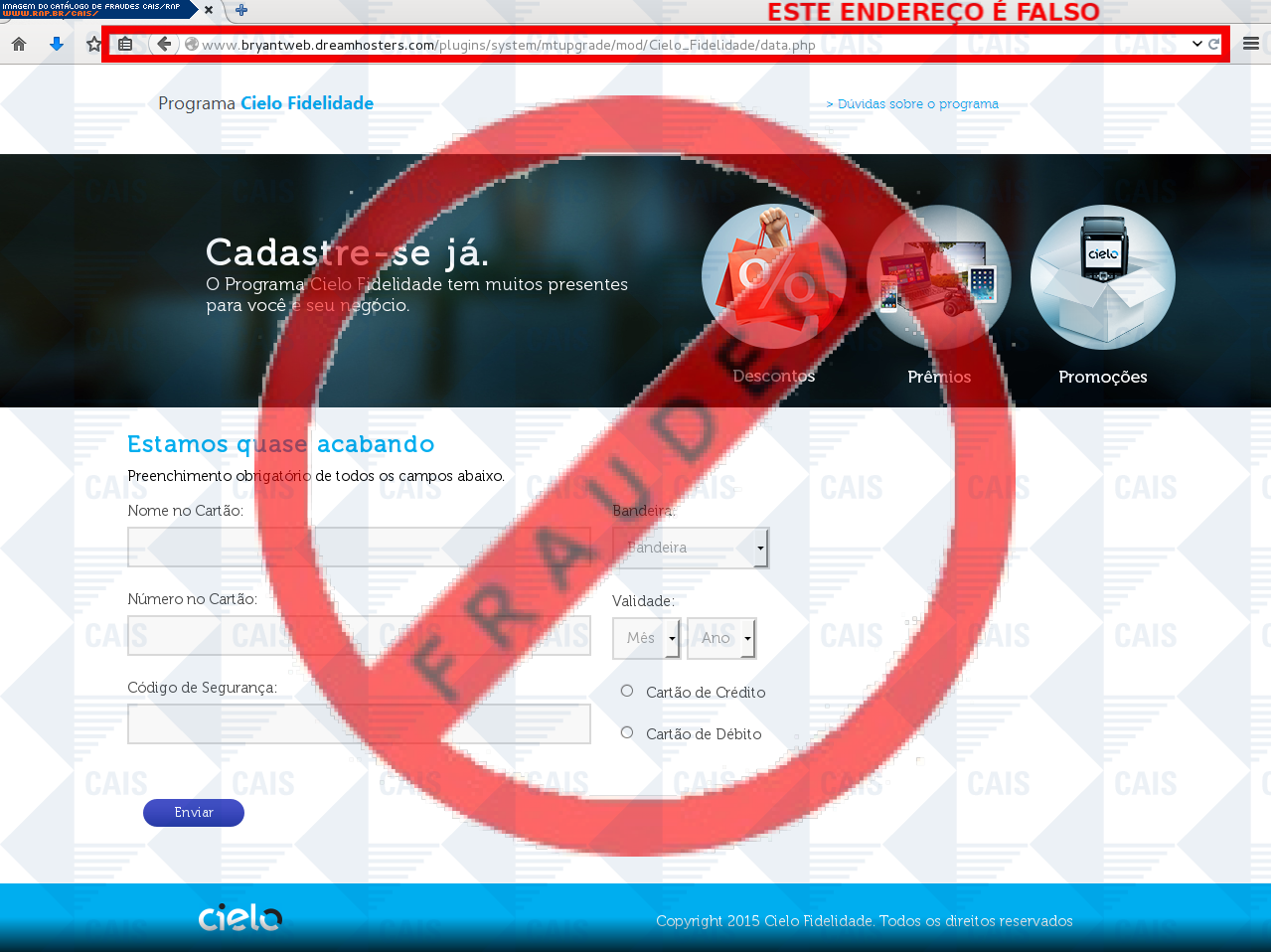 | comentário | A vítima recebe um e-mail informando sobre promoções relacionados a seu cartão Cielo sendo necessário realizar um cadastro, no entanto a página é falsa destinada a roubar os dados do cartão de crédito do usuário. | |