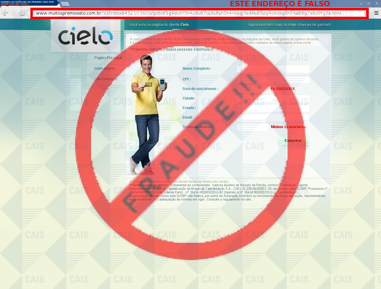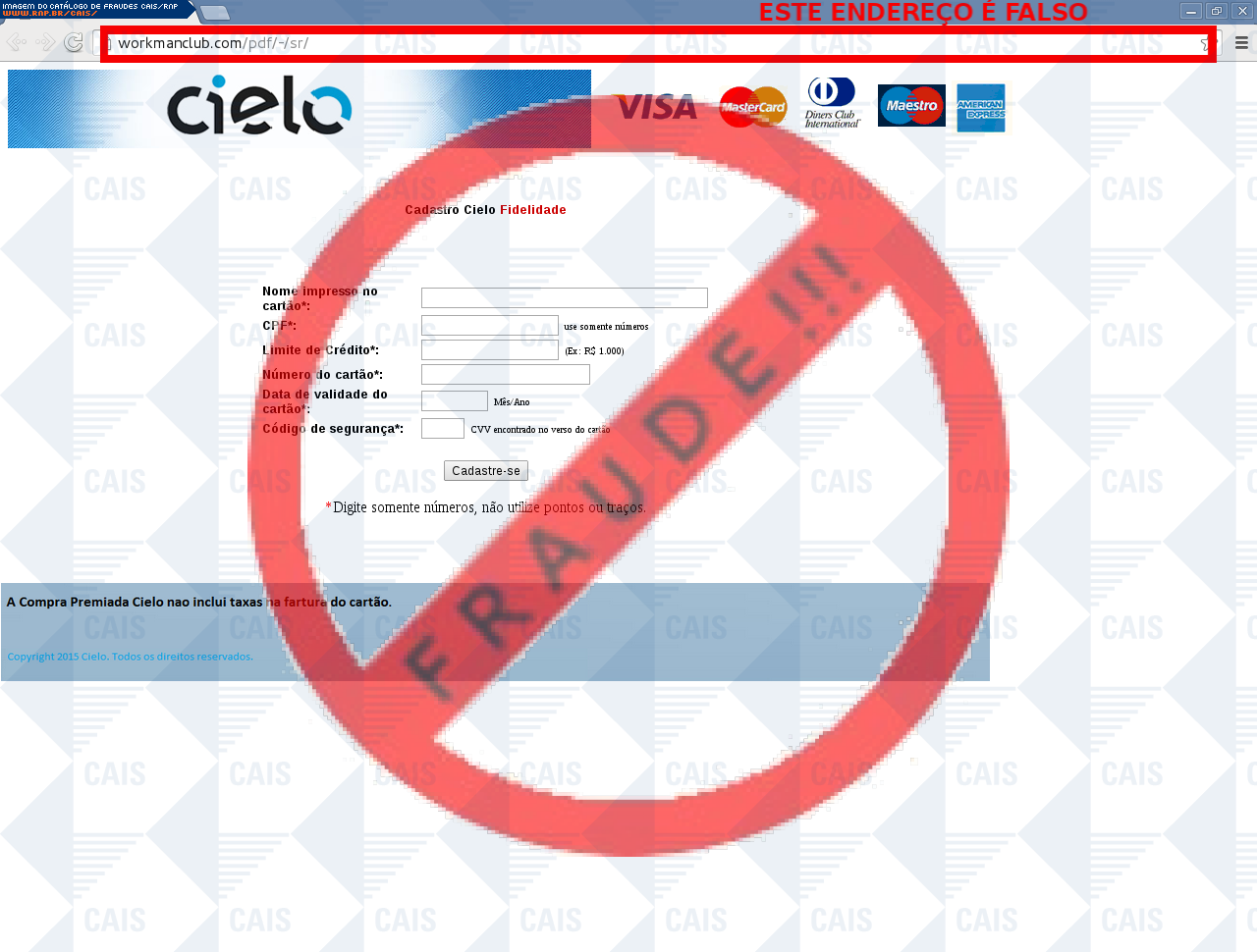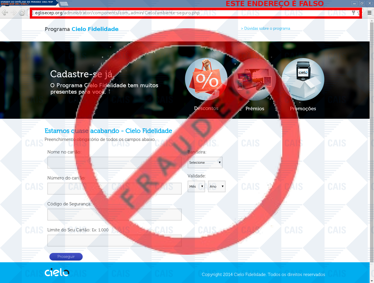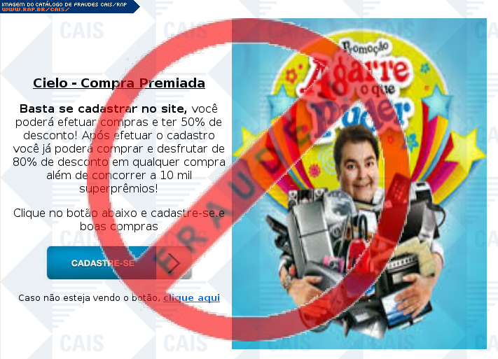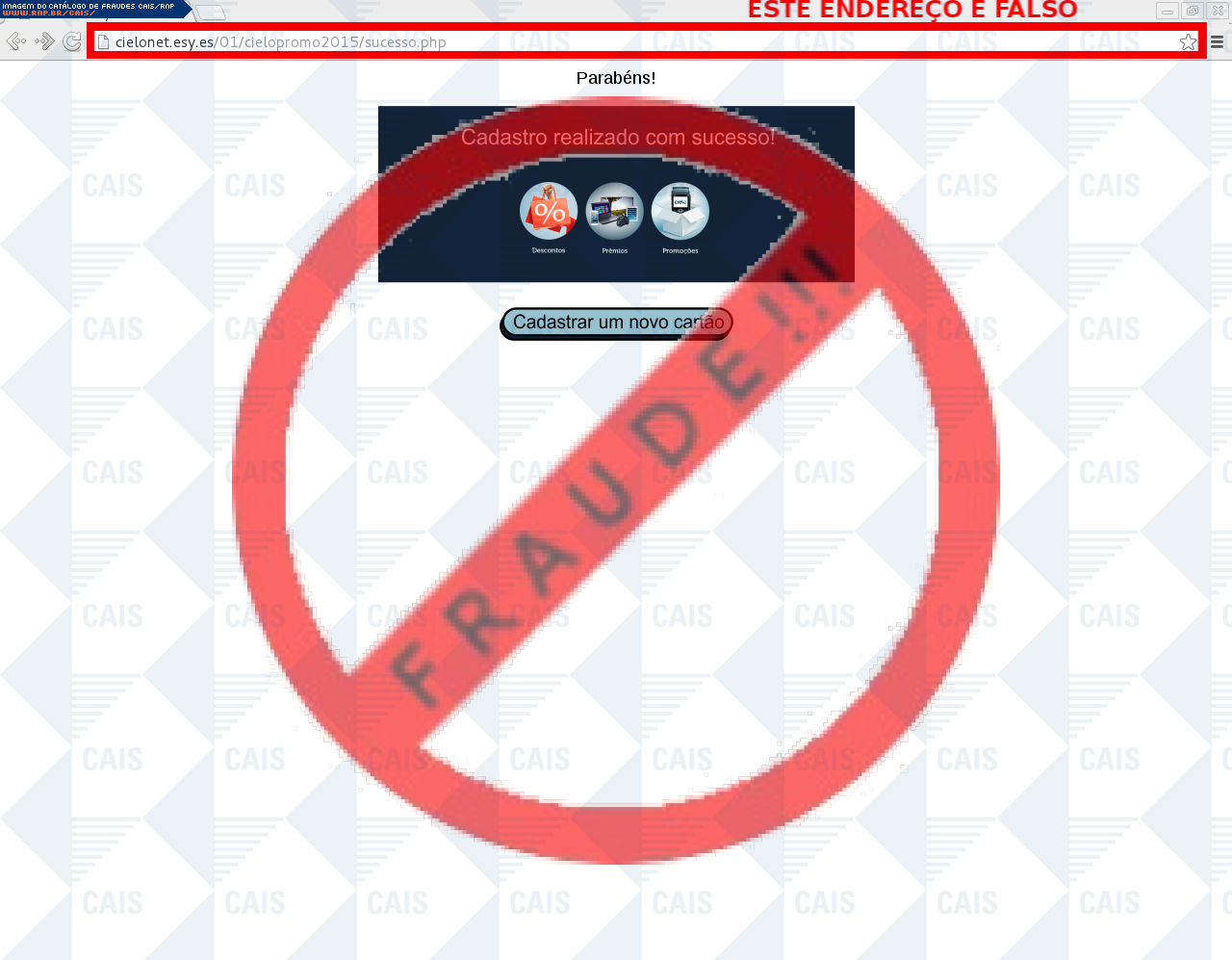 | comentário | A vítima recebe um e-mail informando sobre promoções relacionados a seu cartão Cielo sendo necessário realizar um cadastro, no entanto a página é falsa destinada a roubar os dados do cartão de crédito do usuário. | |