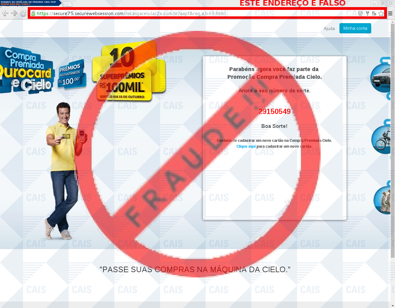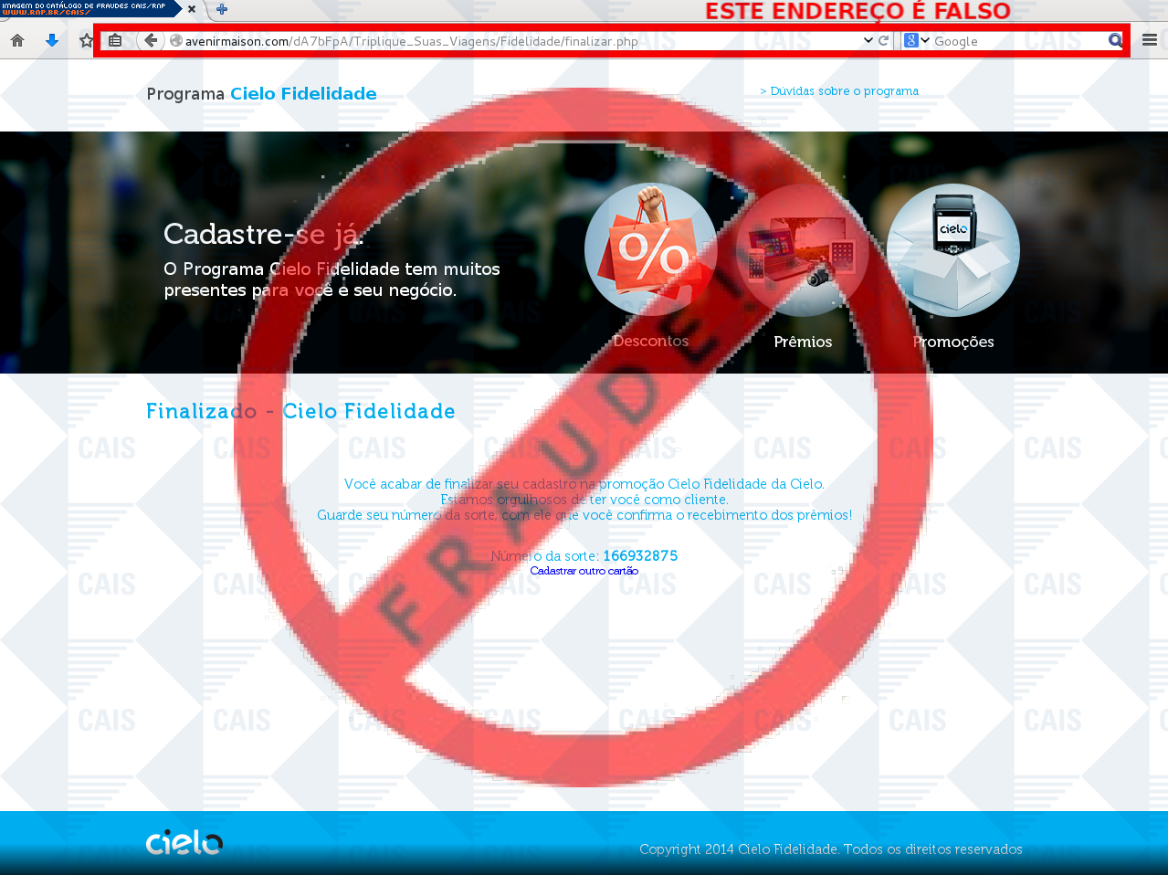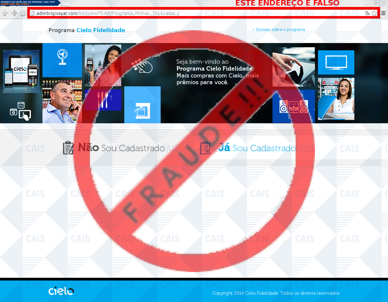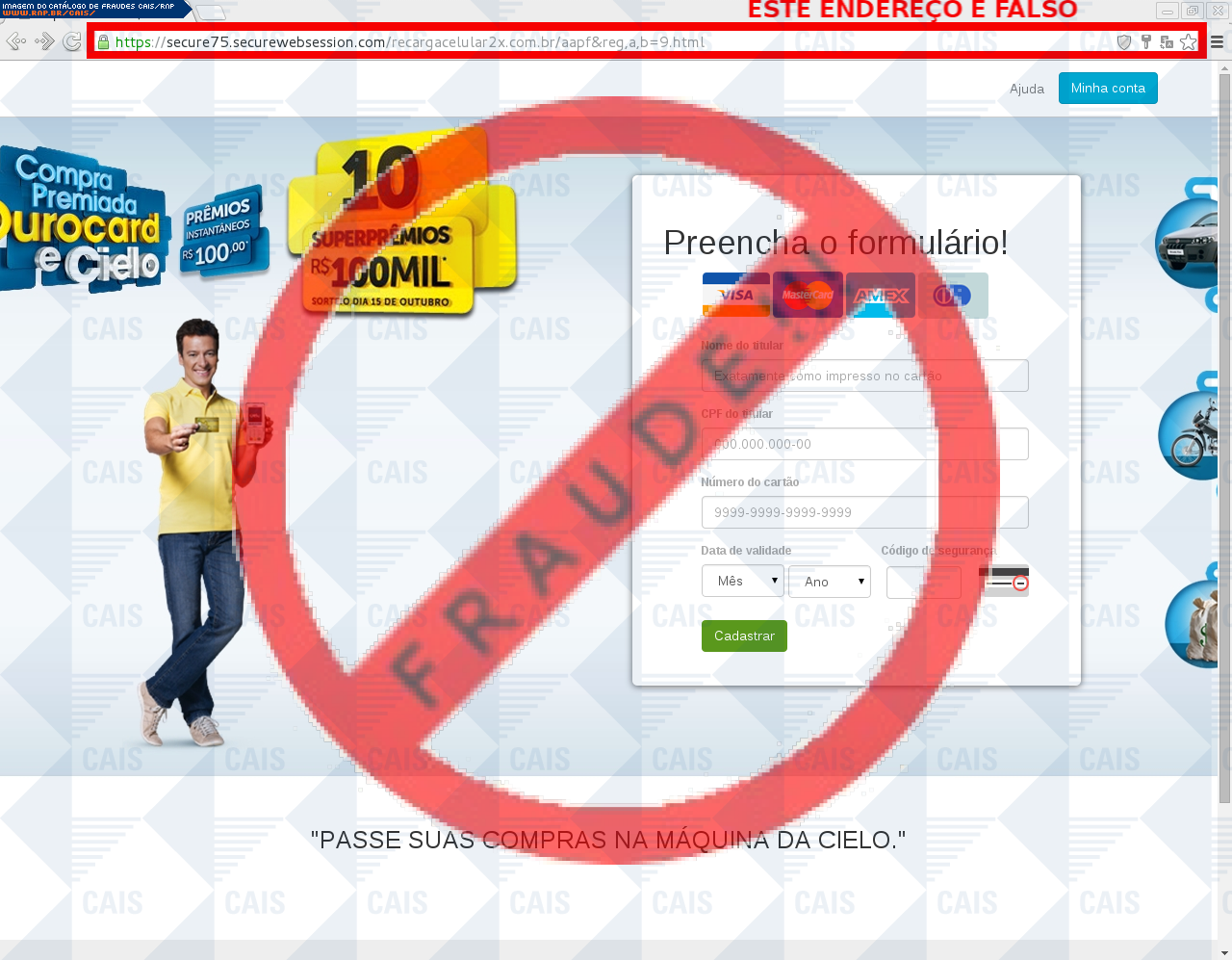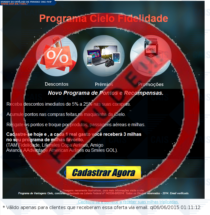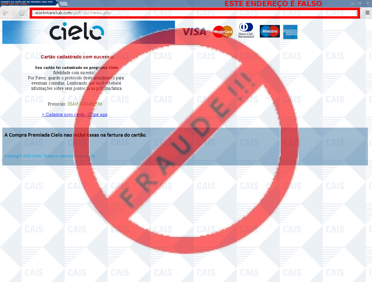 | comentário | A vítima recebe um e-mail informando sobre promoções relacionados a seu cartão Cielo sendo necessário realizar um cadastro, no entanto a página é falsa destinada a roubar os dados do cartão de crédito do usuário. | |