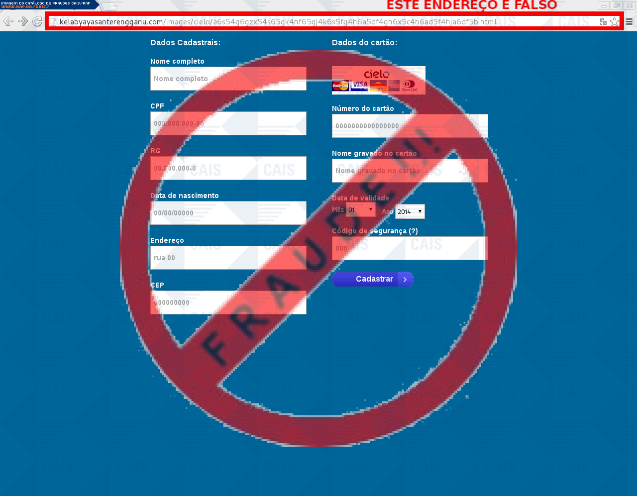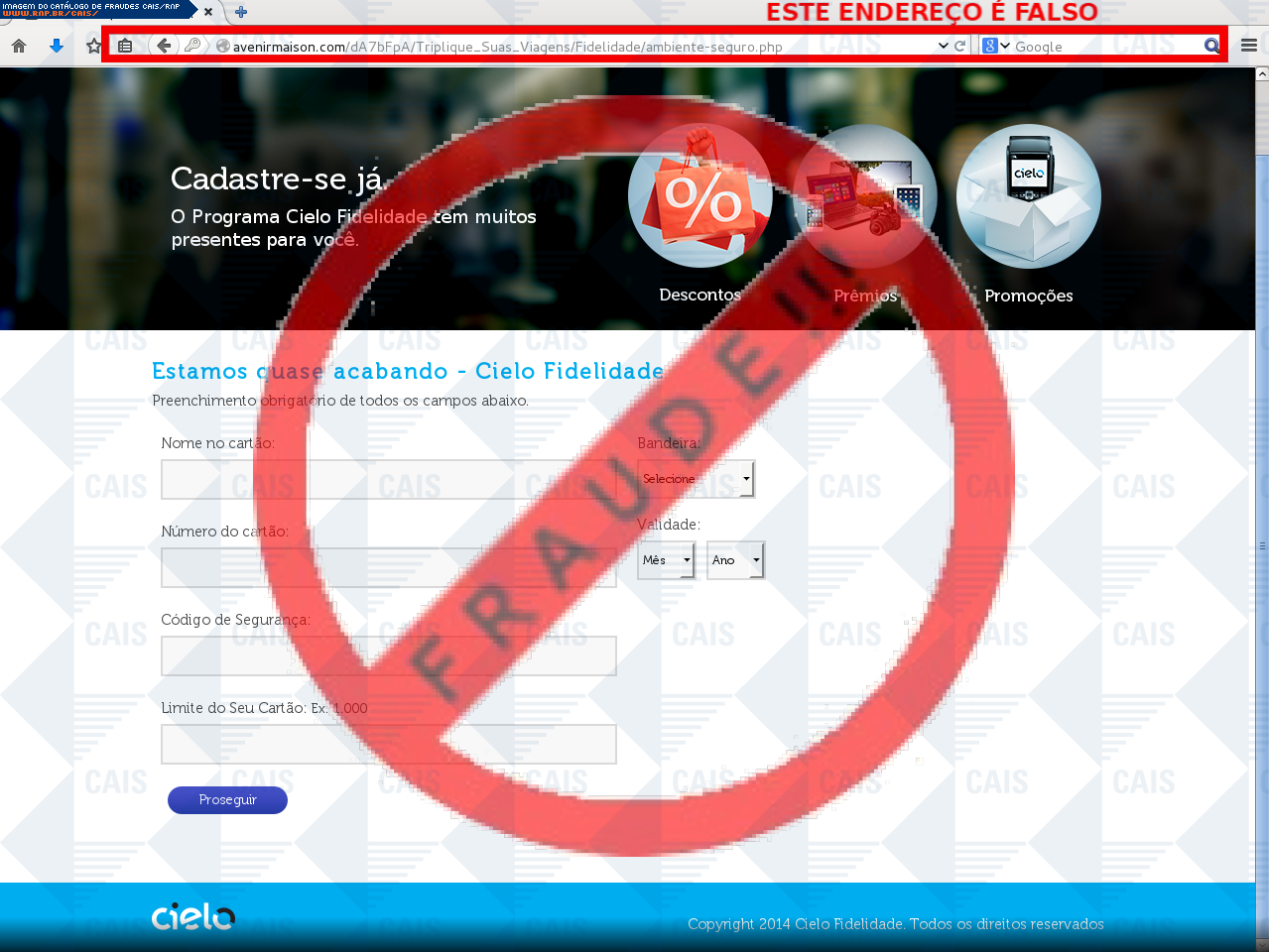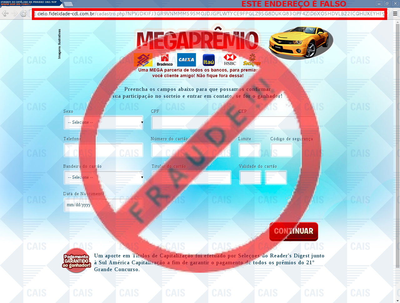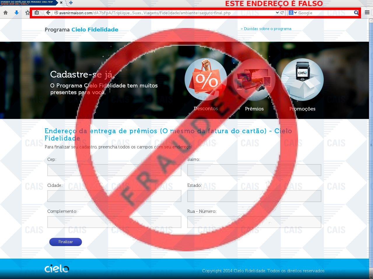 | comentário | A vítima recebe um e-mail informando sobre promoções relacionados a seu cartão Cielo sendo necessário realizar um cadastro, no entanto a página é falsa destinada a roubar os dados do cartão de crédito do usuário. | |