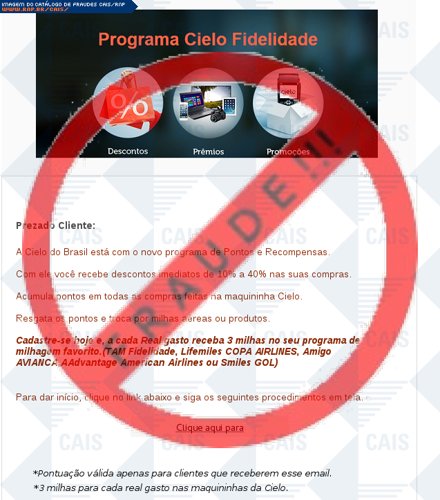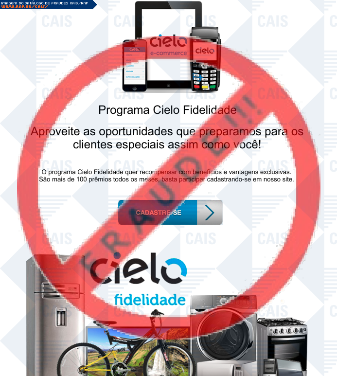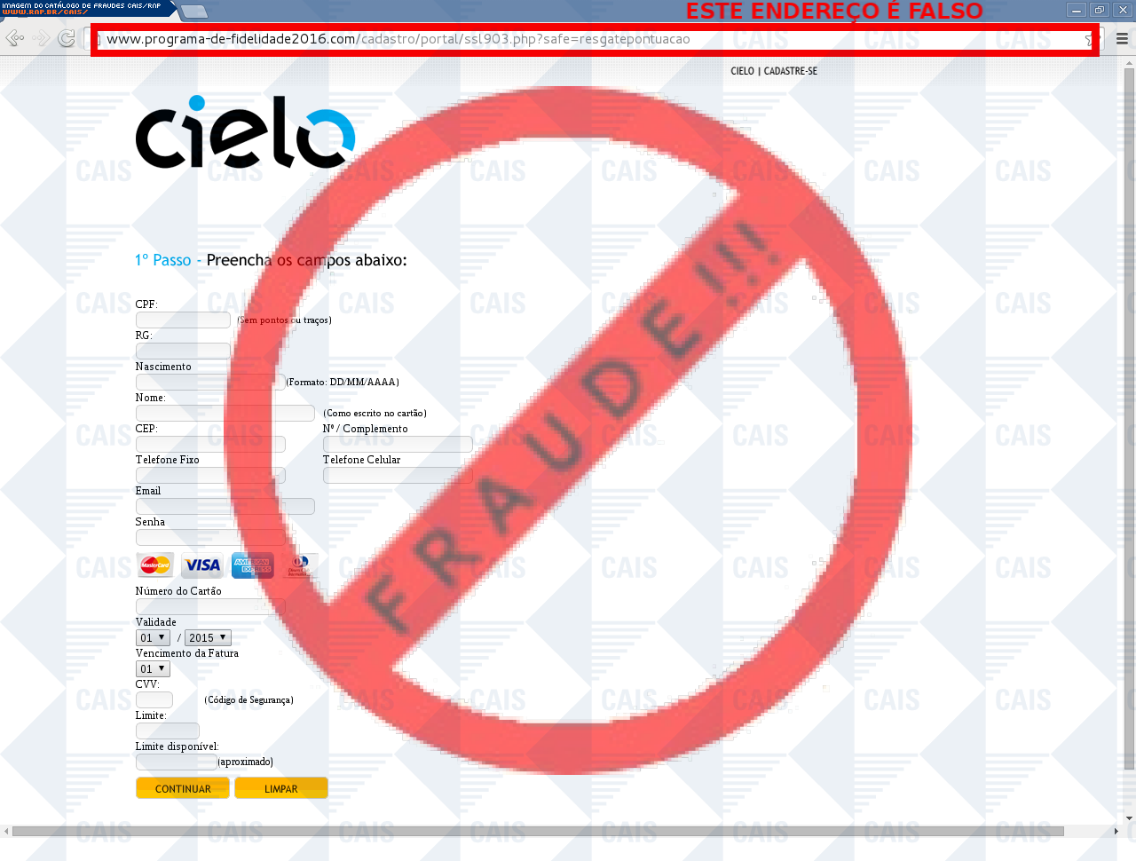 | comentário | A vítima recebe um e-mail informando sobre os benefícios do programa de fidelidade do cartão Cielo disponibilizando o link para cadastro, no entanto a página é falsa criada para roubar as informações do cartão da vítima. | |
