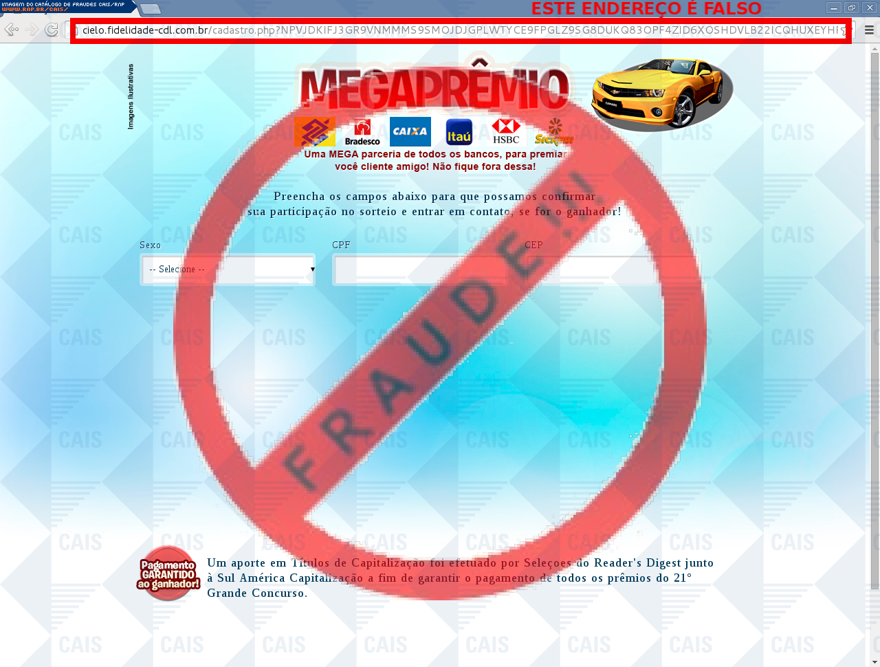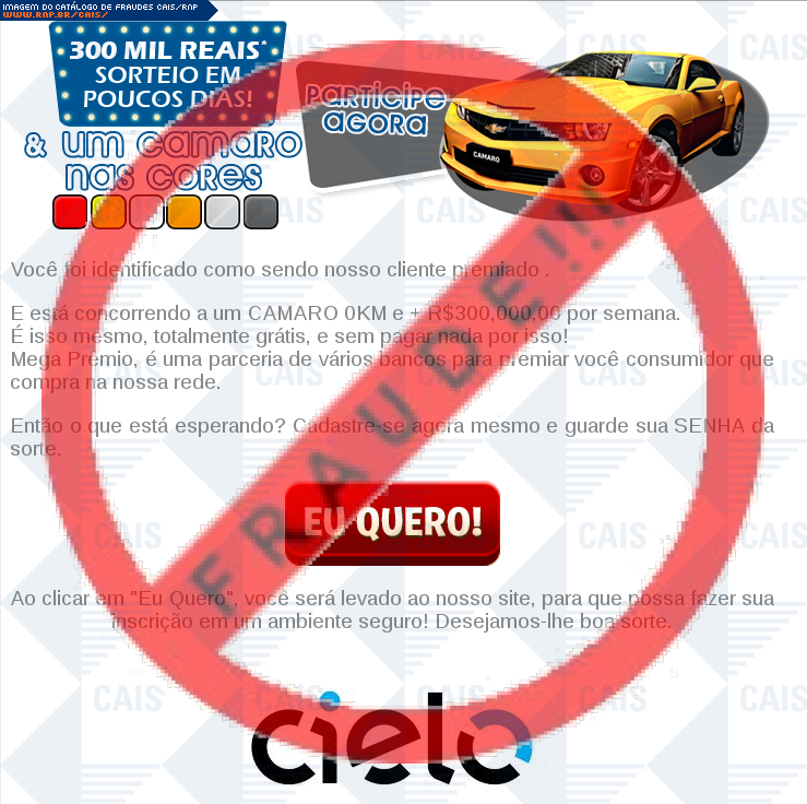 | comentário | A vítima recebe um e-mail informando sobre uma promoção para ganhar um carro Camaro relacionados a seu cartão Cielo sendo necessário realizar um cadastro, no entanto a página é falsa destinada a roubar os dados do cartão de crédito do usuário. | |