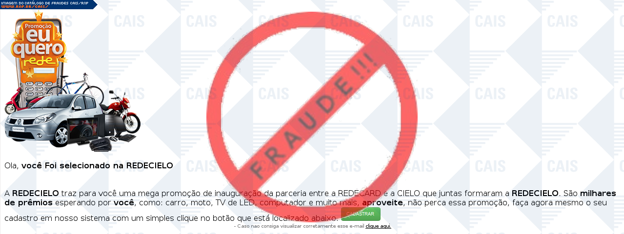 | comentário | A vítima recebe um e-mail relacionado a seu cartão Cielo sendo necessário realizar um cadastro para participar de uma promoção, no entanto a página é falsa destinada a roubar os dados do cartão de crédito do usuário. | |