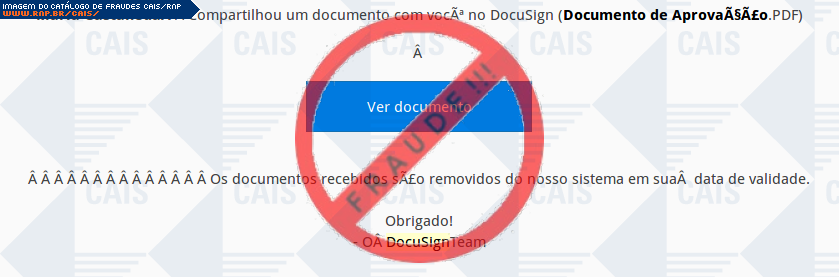 Esta página tem função informativa e educativa. Exibe uma coleção de imagens de phishing scam (fraudes eletrônicas) ou malware (código malicioso) veiculados por meio de spam (e-mail não-solicitado). Trata-se de conteúdo exemplificativo, não exaustivo, uma vez que não é possível contemplar todos os casos de fraudes existentes. Assim, caso você tenha conhecimento de um exemplar que não esteja aqui presente, isto não significa que não seja válido ou real. Inclusive incentivamos que você o envie para análise do CAIS para que, se for o caso, passe a integrar o nosso acervo.
