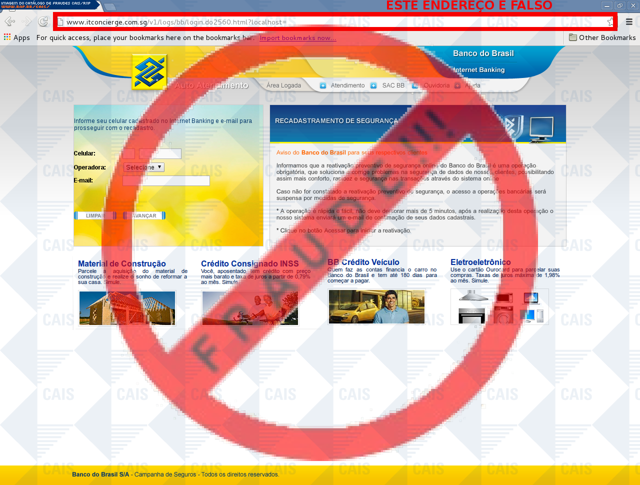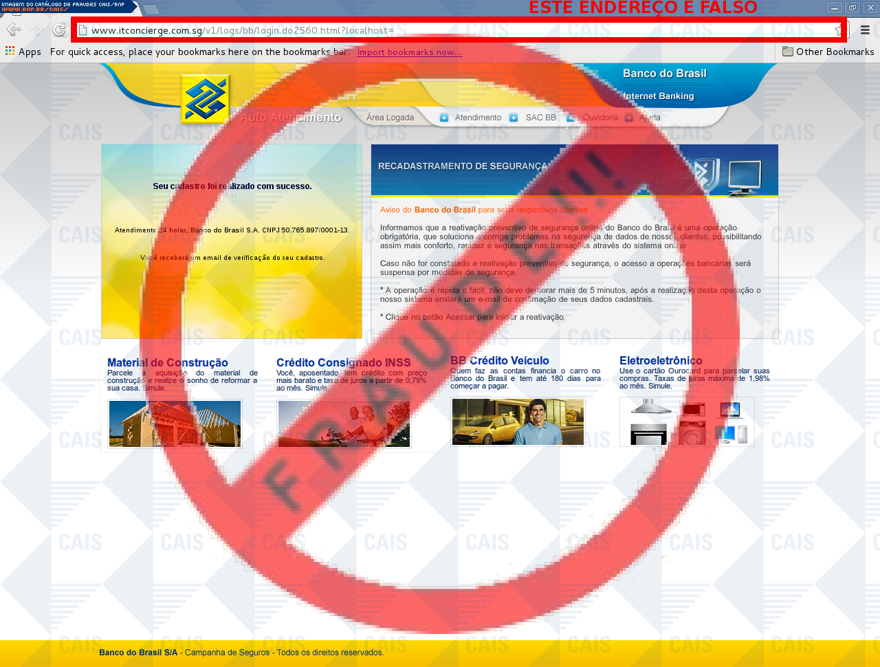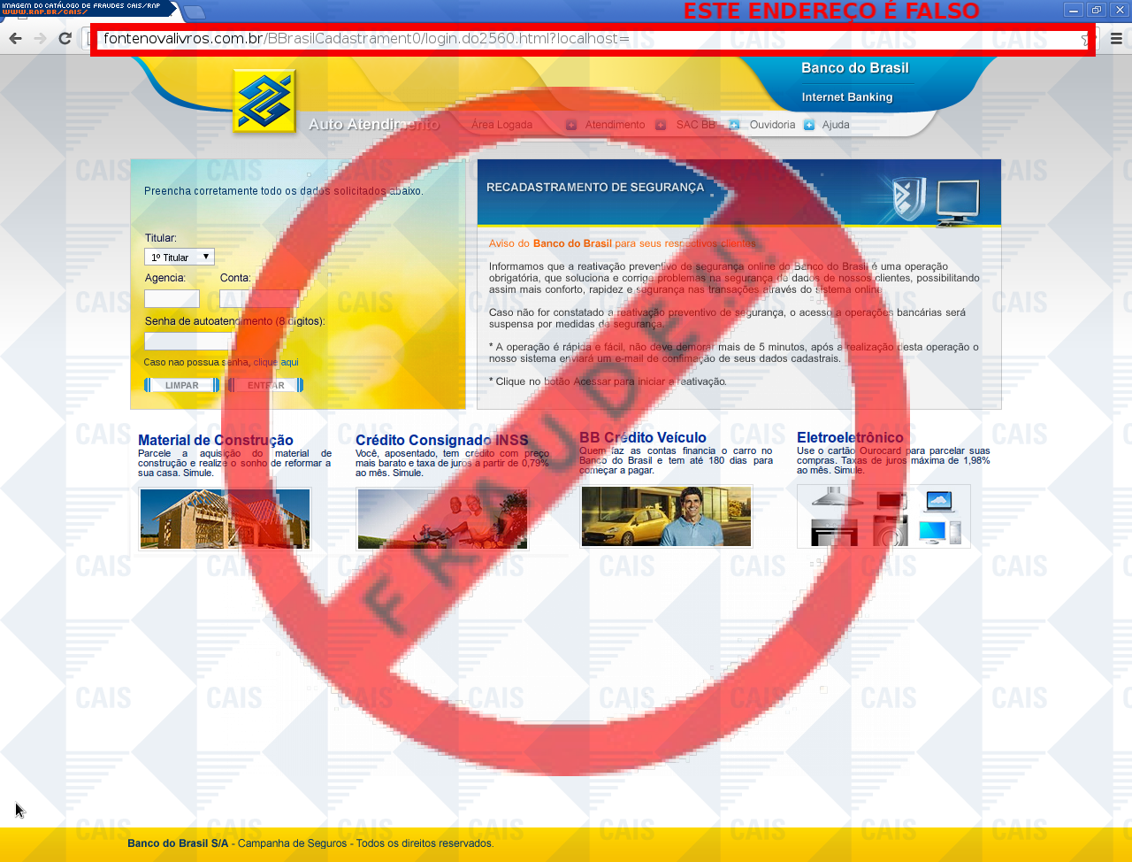 | comentário | A vítima recebe um e-mail solicitando o recadastramento de sua conta no Banco do Brasil, porem a página maliciosa rouba as informações bancarias do cliente. | |