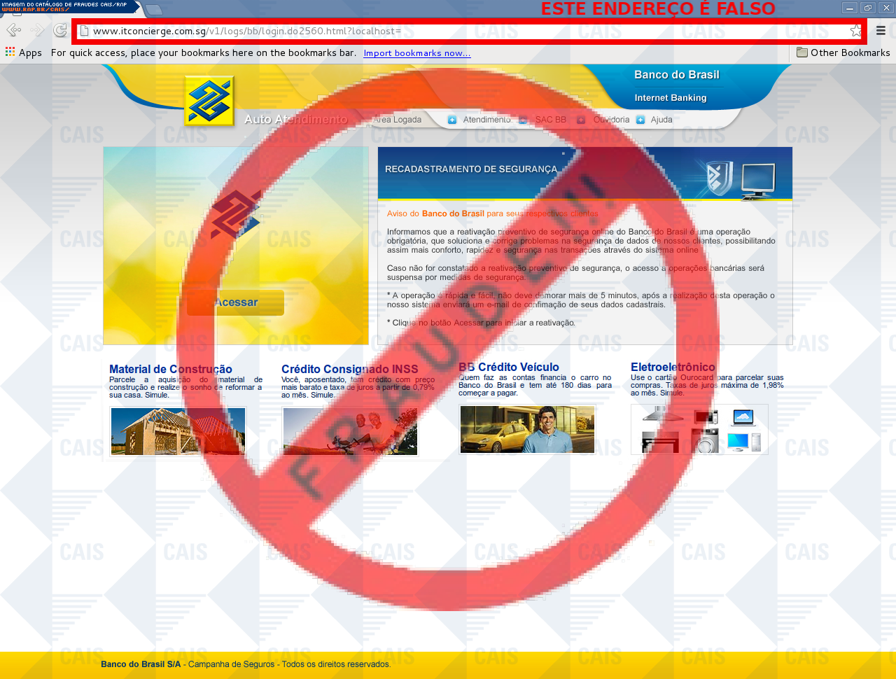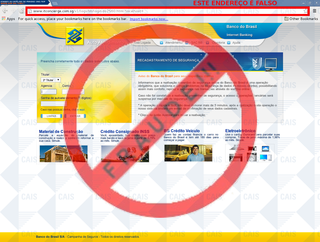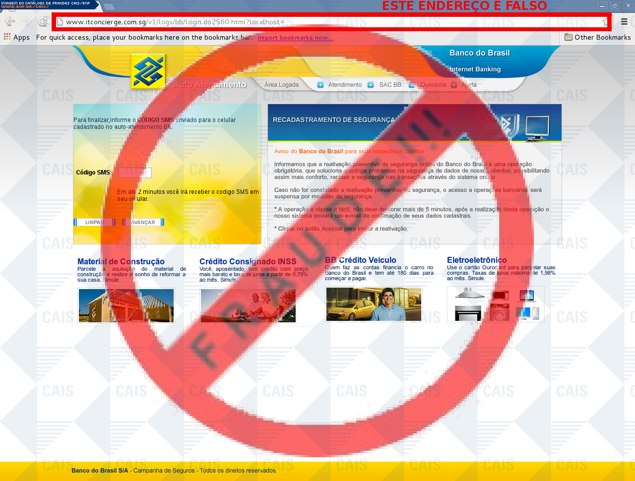 | comentário | A vítima recebe um e-mail solicitando o recadastramento de sua conta no Banco do Brasil, porem a página maliciosa rouba as informações bancarias do cliente. | |