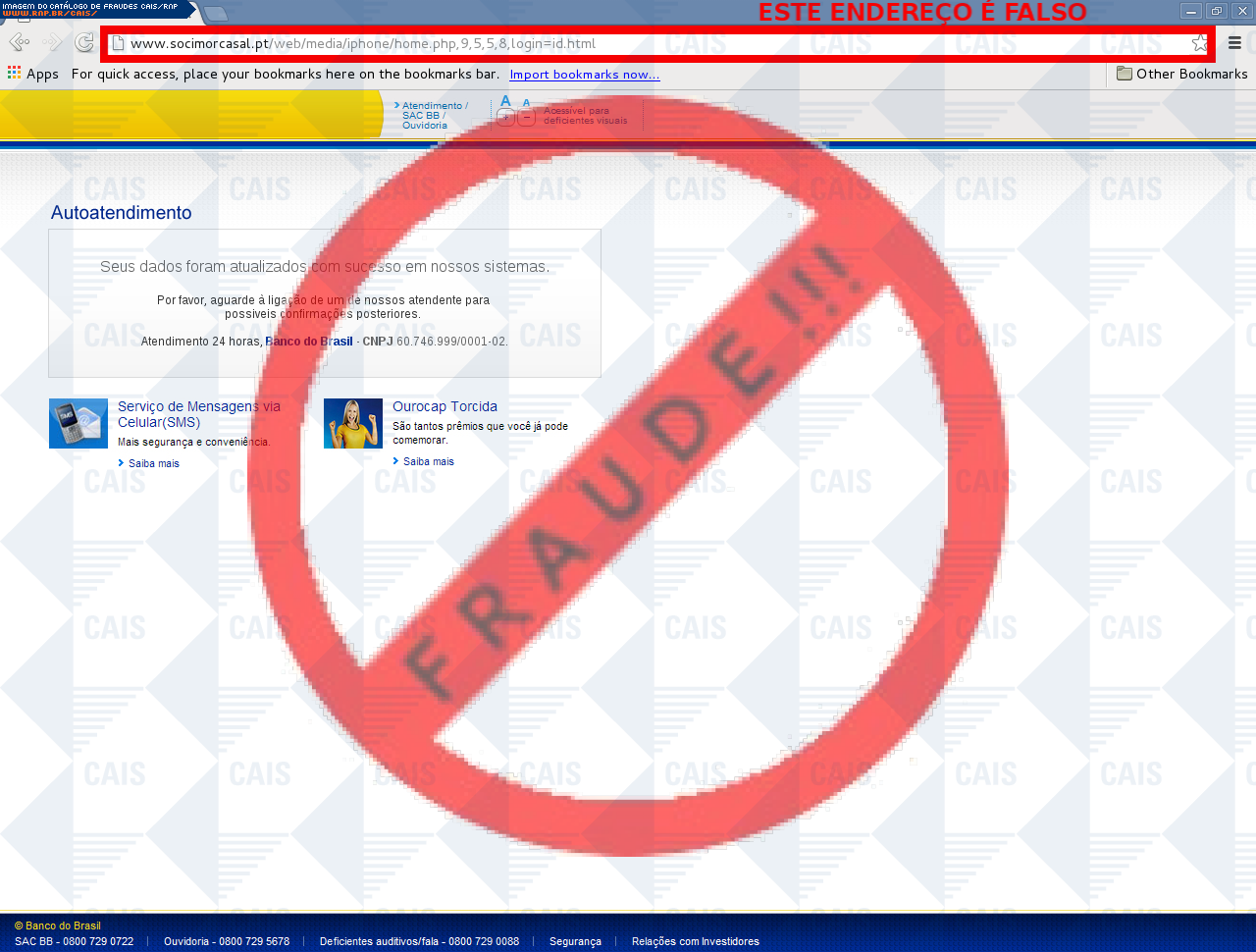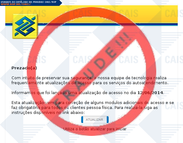 | comentário | O usuário recebe uma mensagem solicitando uma atualização de segurança referente aos serviços de autoatendimento, porém a página é falsa destinada a roubar as informações da vítima. | |