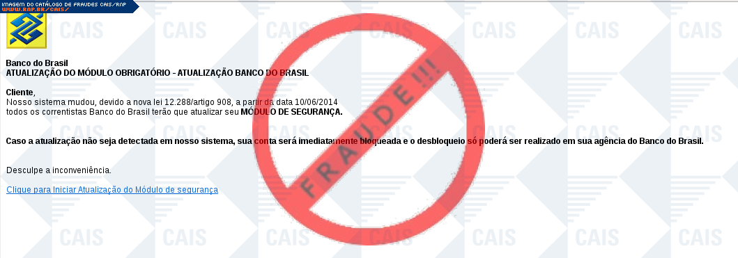 Esta página tem função informativa e educativa. Exibe uma coleção de imagens de phishing scam (fraudes eletrônicas) ou malware (código malicioso) veiculados por meio de spam (e-mail não-solicitado). Trata-se de conteúdo exemplificativo, não exaustivo, uma vez que não é possível contemplar todos os casos de fraudes existentes. Assim, caso você tenha conhecimento de um exemplar que não esteja aqui presente, isto não significa que não seja válido ou real. Inclusive incentivamos que você o envie para análise do CAIS para que, se for o caso, passe a integrar o nosso acervo.