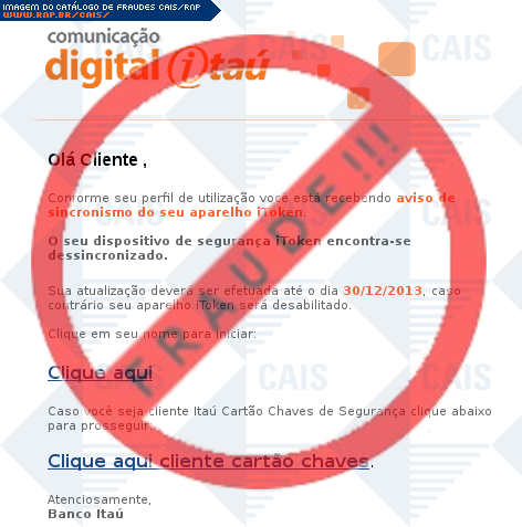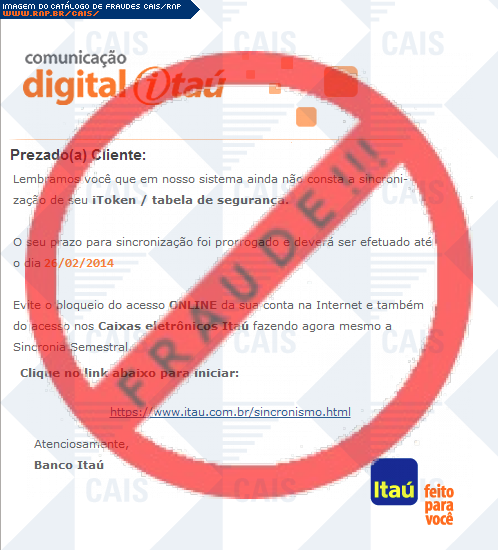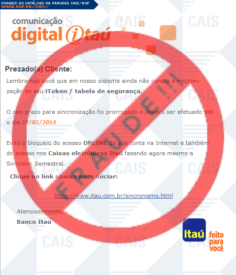 | comentário | A vítima recebe uma mensagem, informando que será necessário sincronizar seu Itoken, e a sincronização é obrigatória para todos os clientes. Mas ao clicar no link, a vítima é direcionada para uma página falsa. | |
