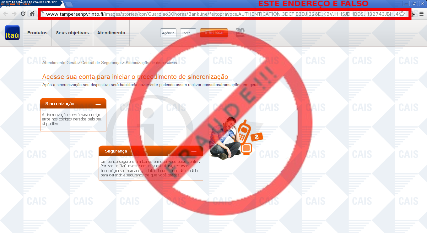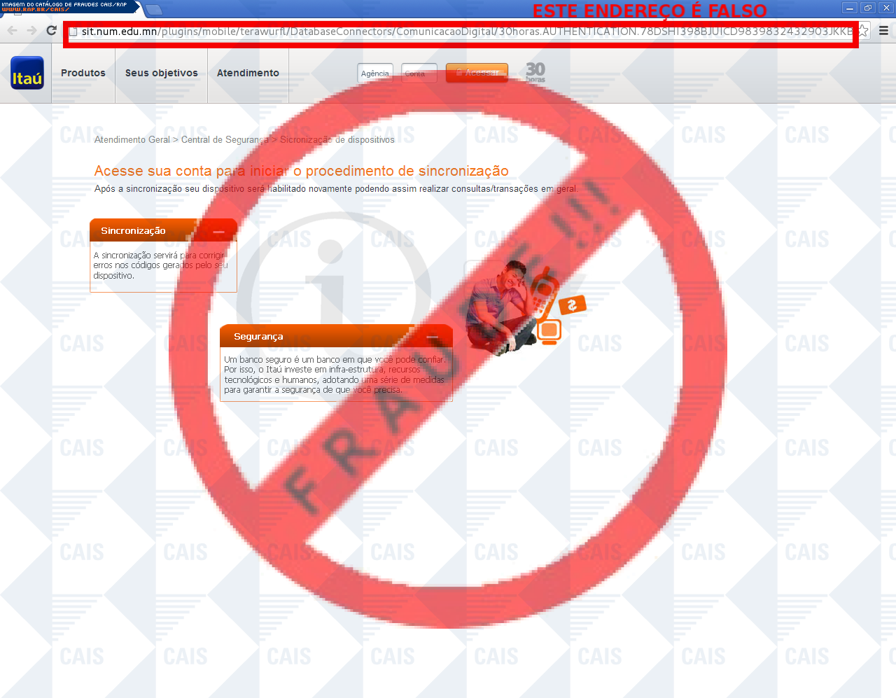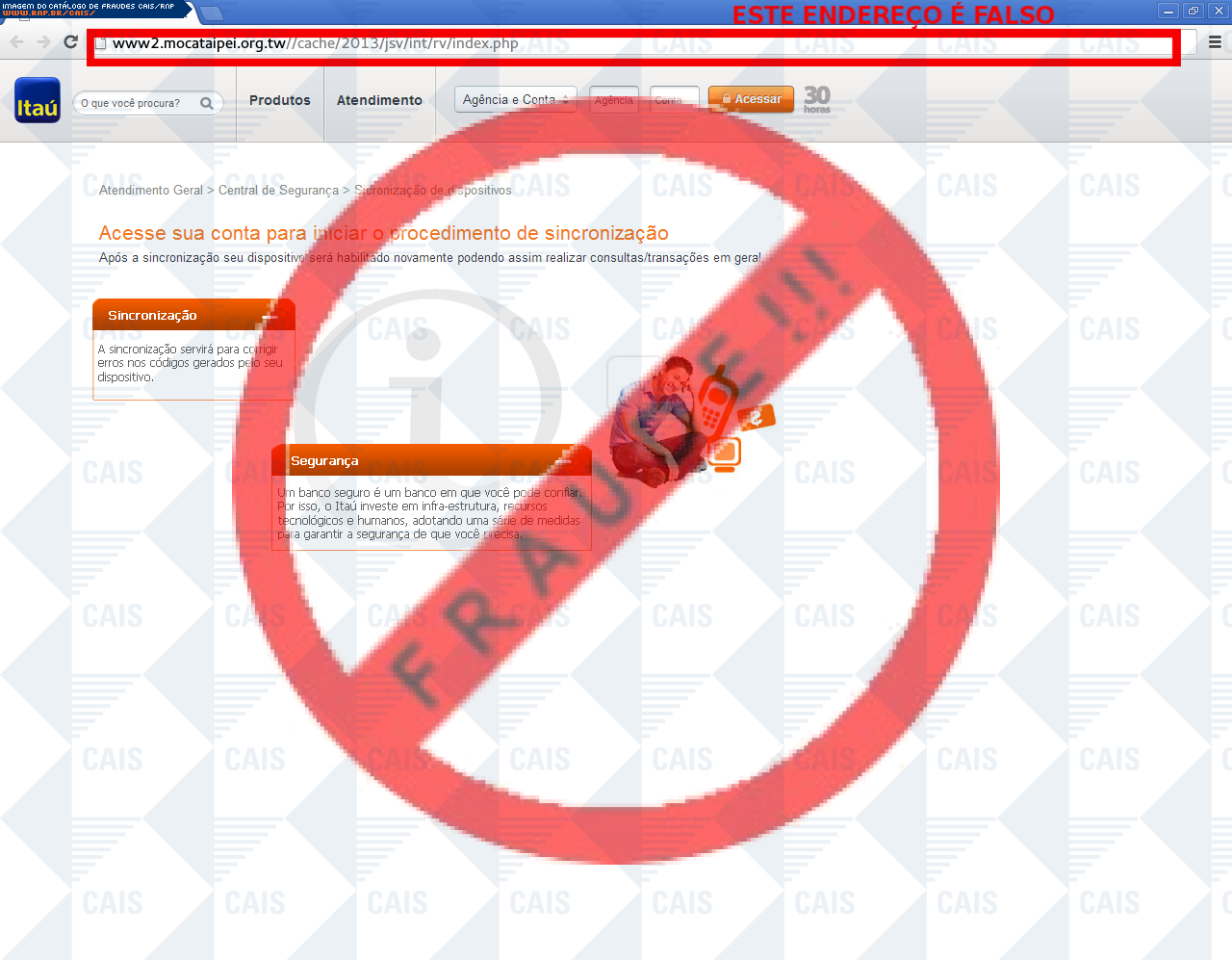 | comentário | A vítima recebe uma mensagem, informando que no sistema não consta a sincronização do seu dispositivo de segurança. Mas ao clicar no link para sincronizar, a vítima é direcionada para uma página falsa, que é semelhante a original. | |