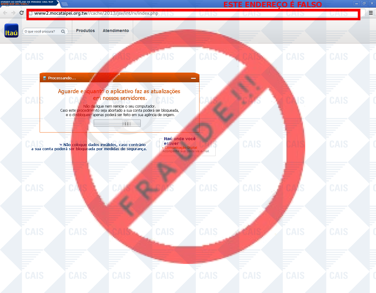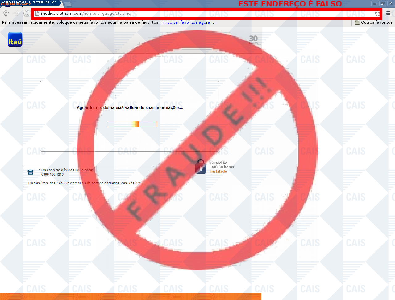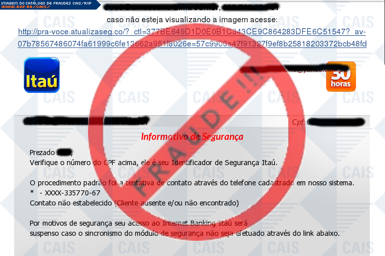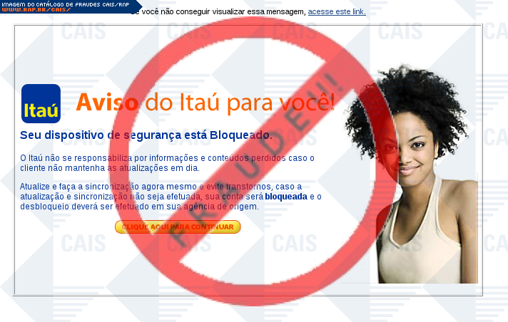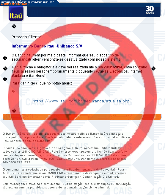 Esta página tem função informativa e educativa. Exibe uma coleção de imagens de phishing scam (fraudes eletrônicas) ou malware (código malicioso) veiculados por meio de spam (e-mail não-solicitado). Trata-se de conteúdo exemplificativo, não exaustivo, uma vez que não é possível contemplar todos os casos de fraudes existentes. Assim, caso você tenha conhecimento de um exemplar que não esteja aqui presente, isto não significa que não seja válido ou real. Inclusive incentivamos que você o envie para análise do CAIS para que, se for o caso, passe a integrar o nosso acervo.