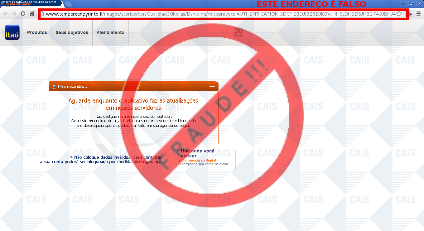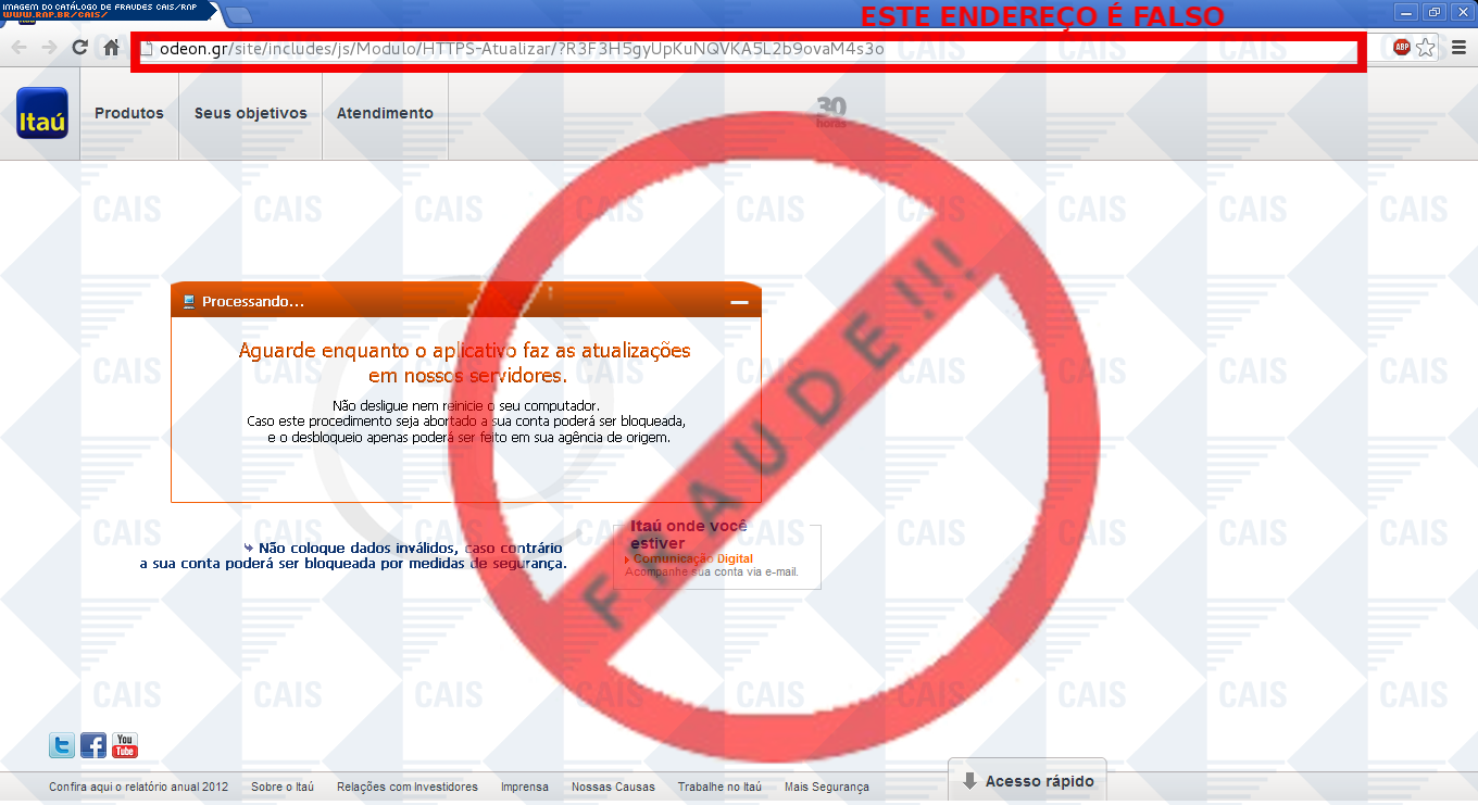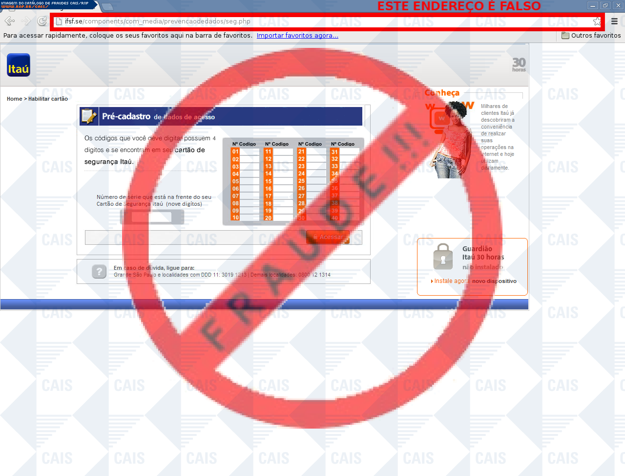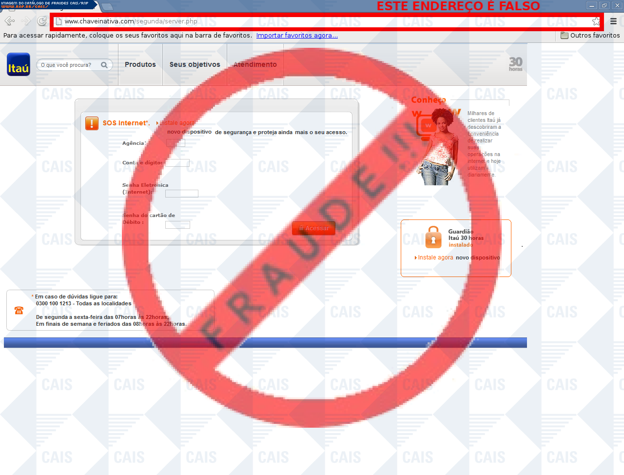 Esta página tem função informativa e educativa. Exibe uma coleção de imagens de phishing scam (fraudes eletrônicas) ou malware (código malicioso) veiculados por meio de spam (e-mail não-solicitado). Trata-se de conteúdo exemplificativo, não exaustivo, uma vez que não é possível contemplar todos os casos de fraudes existentes. Assim, caso você tenha conhecimento de um exemplar que não esteja aqui presente, isto não significa que não seja válido ou real. Inclusive incentivamos que você o envie para análise do CAIS para que, se for o caso, passe a integrar o nosso acervo.