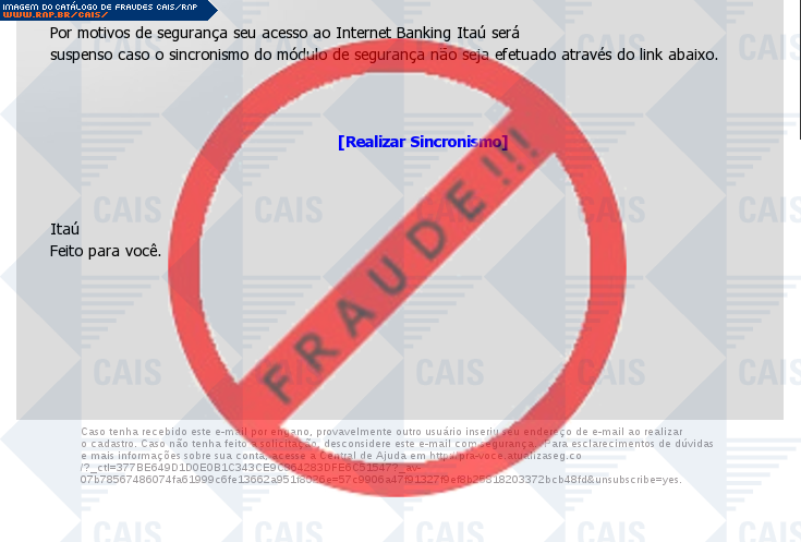 | comentário | A vítima recebe um email bancário fraudulento a respeito de um procedimento de sincronização. Na mensagem aparece o nome e o CPF ORIGINAL da vítima. O link para realizar a suposta sincronização direciona para um site de phishing. | |
