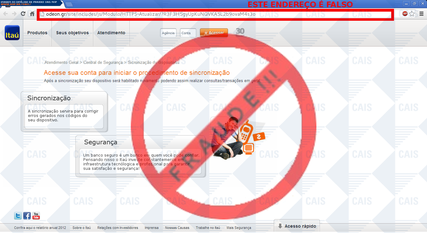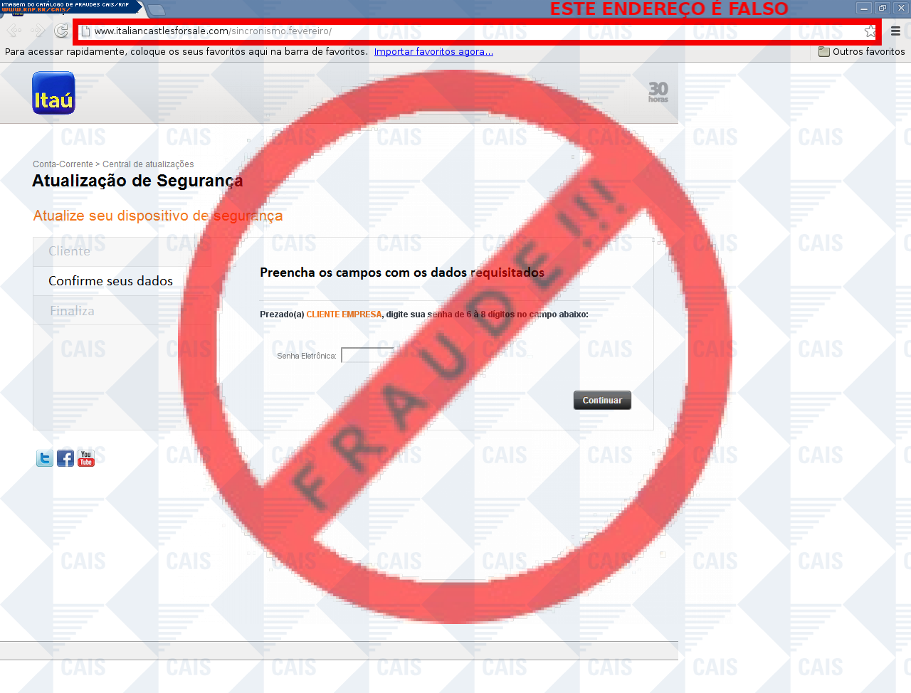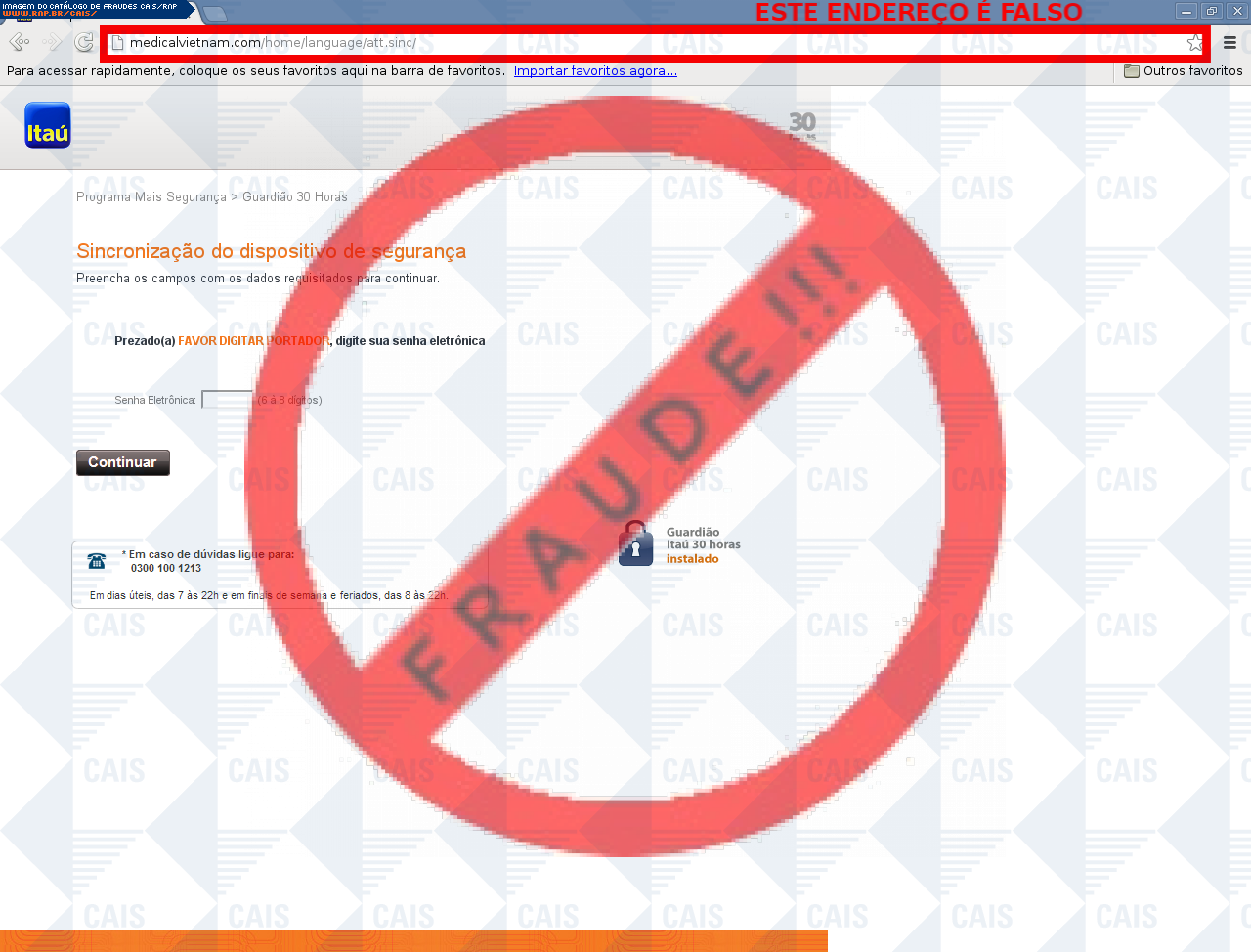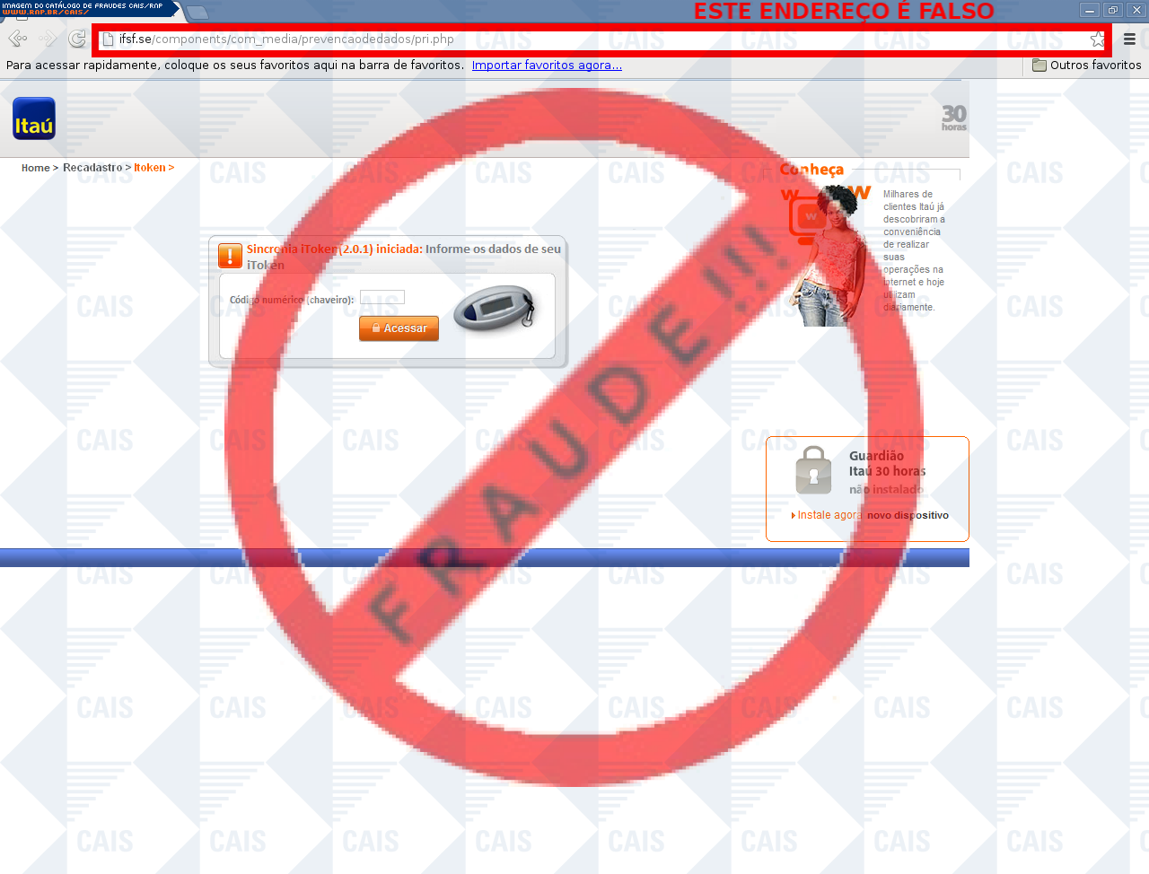 | comentário | A vítima recebe uma mensagem, informando que no sistema não consta a sincronização de seu Itoken, e o prazo está acabando. Mas ao clicar no link para realizar a sincronização, a vítima é direcionada para uma página falsa. | |