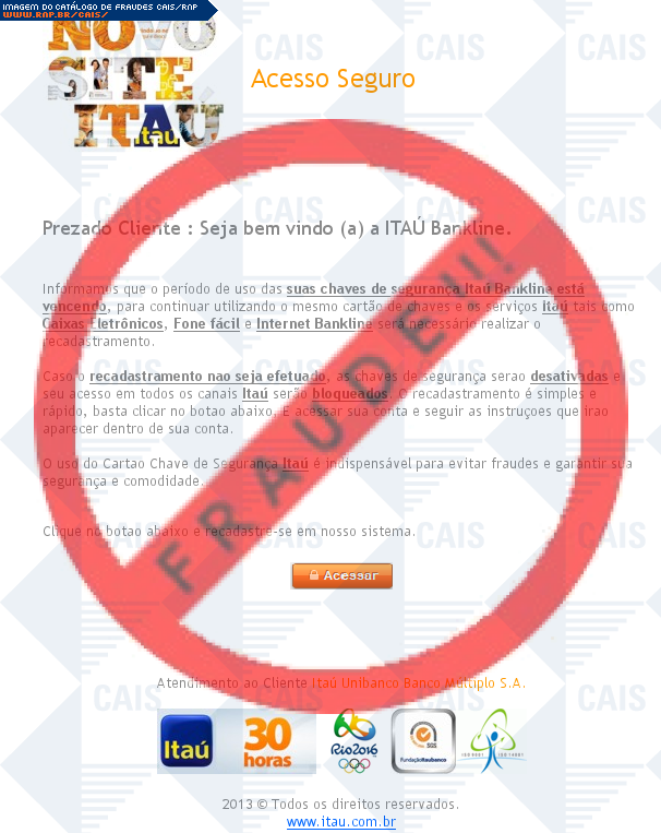 | assunto | Informamos que o período de uso das suas chaves de segurança Itaú Bankline está vencendo, para continuar utilizando o mesmo cartão de chaves e os serviços itaú é necessário o recadastramento das chaves. | |