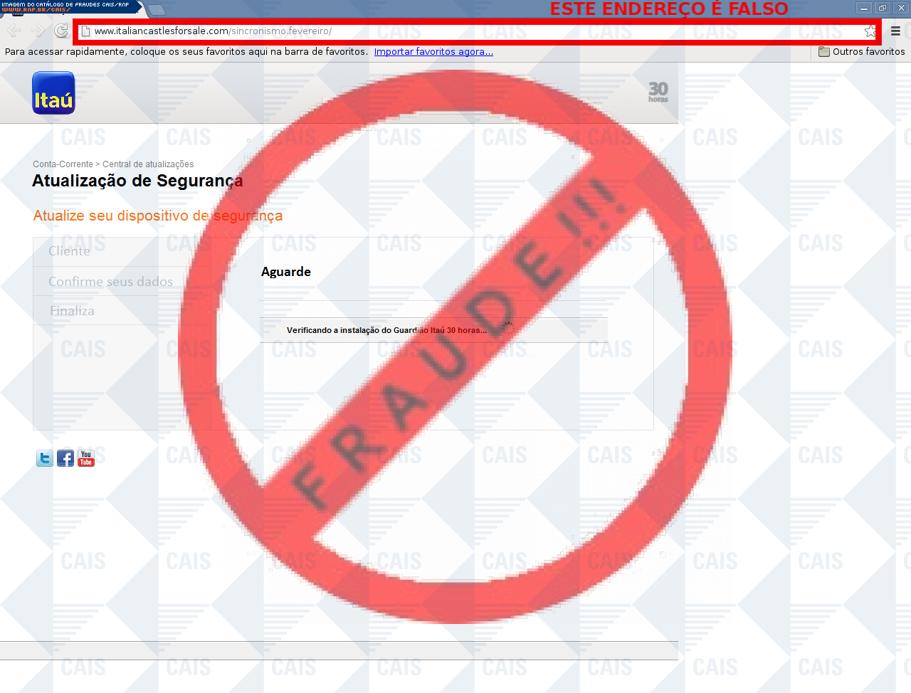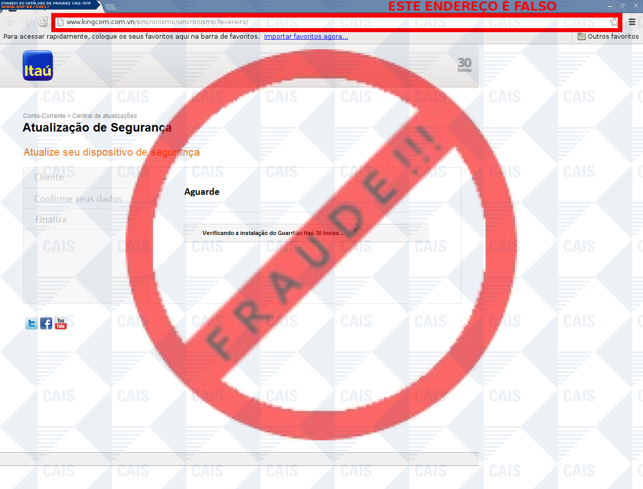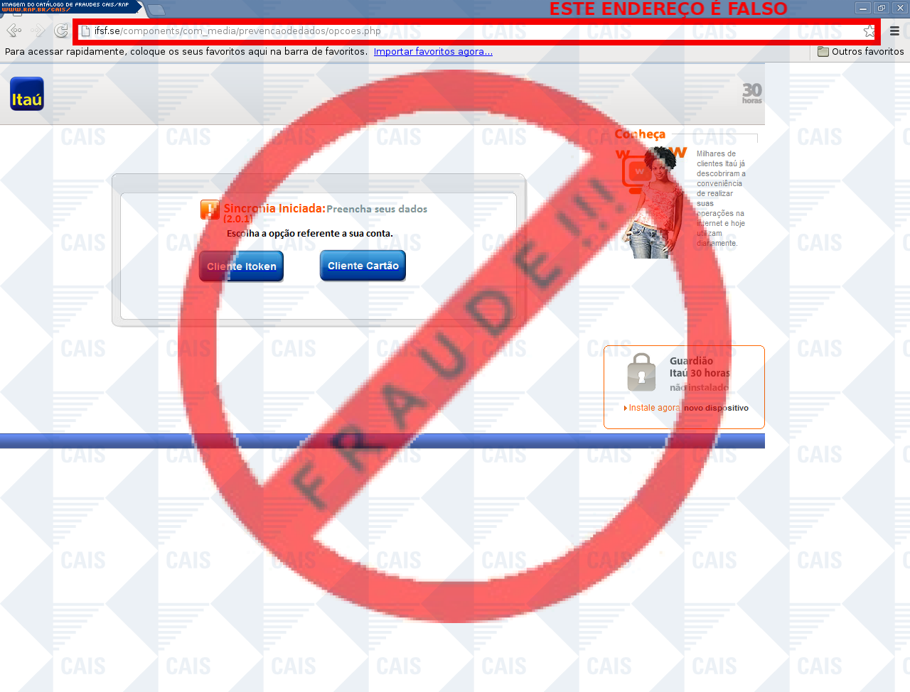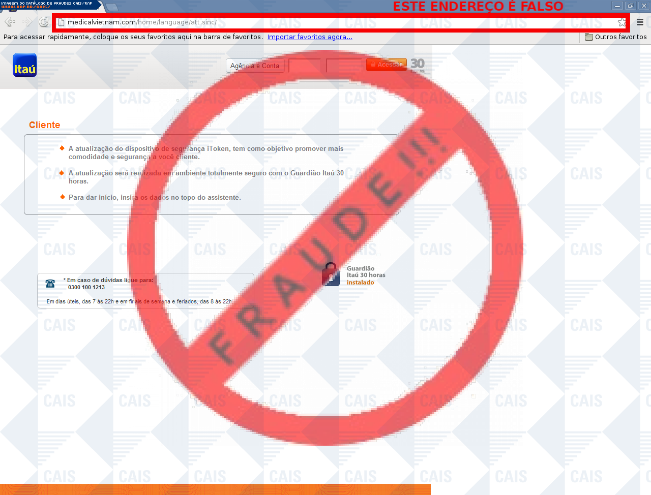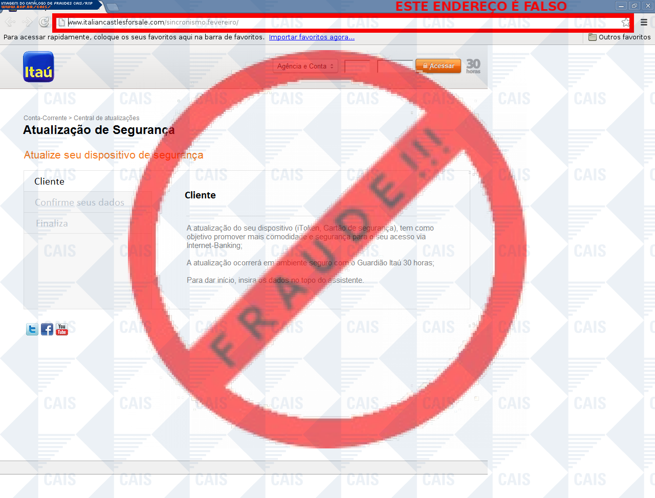 | comentário | A vítima recebe uma mensagem, informando que seu dispositivo (iToken) encontra-se desatualizado com o sistema, mas ao clicar no link para sincronizar o dispositivo, a vítima é direcionada para uma página falsa. | |