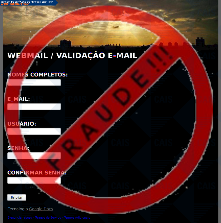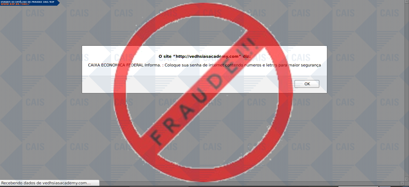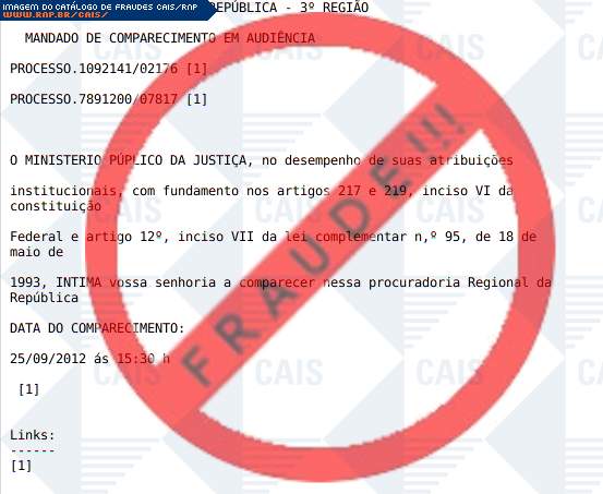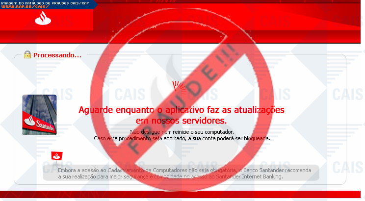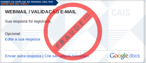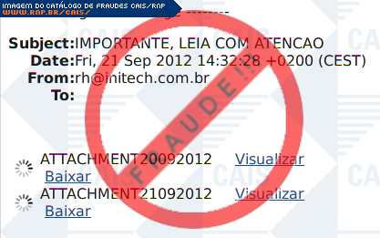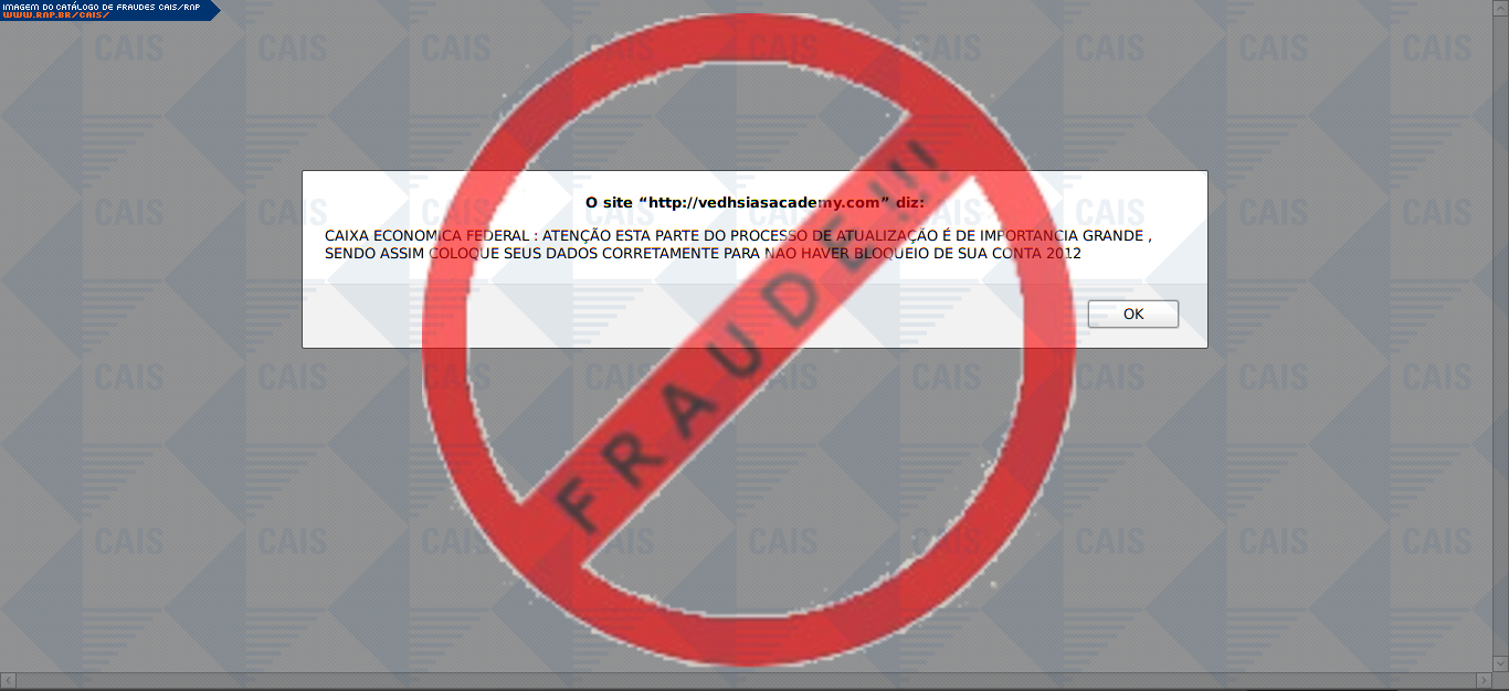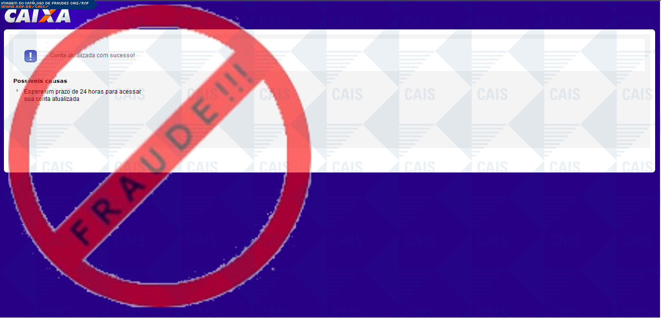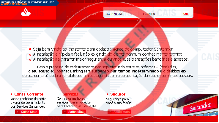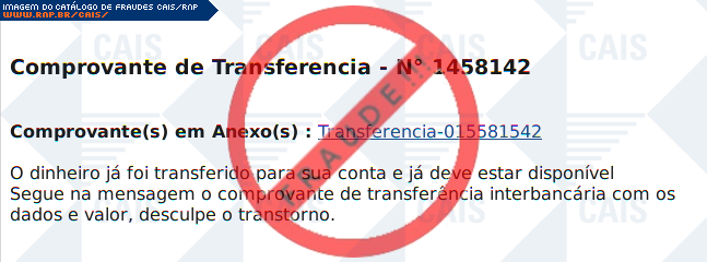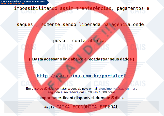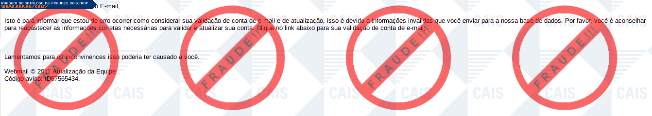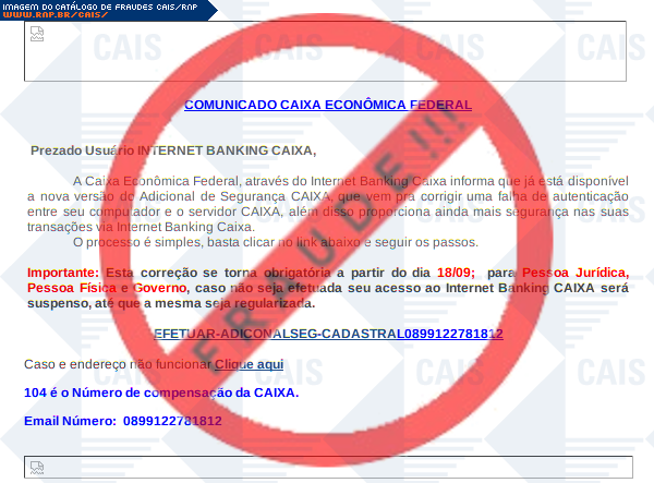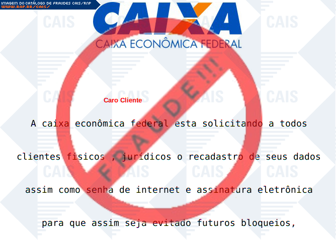 Esta página tem função informativa e educativa. Exibe uma coleção de imagens de phishing scam (fraudes eletrônicas) ou malware (código malicioso) veiculados por meio de spam (e-mail não-solicitado). Trata-se de conteúdo exemplificativo, não exaustivo, uma vez que não é possível contemplar todos os casos de fraudes existentes. Assim, caso você tenha conhecimento de um exemplar que não esteja aqui presente, isto não significa que não seja válido ou real. Inclusive incentivamos que você o envie para análise do CAIS para que, se for o caso, passe a integrar o nosso acervo.