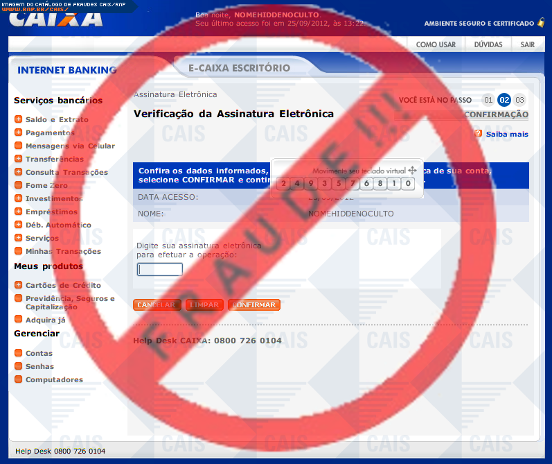 | comentário | Na fraude, uma mensagem é enviada ao usuario solicitando recadastramentos de dados inclusive senha de acesso a internet e assinatura eletronica, porém trata-se de uma pagina falsa com o intuito de adquirir dados pessoais do cliente. | |
