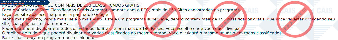 | arquivo malicioso | PCG Programa Classificados Gratis.exe | |