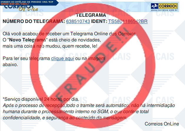 | comentário | Email enviado ao usuario informando que há disponivel online um telegrama para o mesmo, porém há um link para download de um malware.. | |