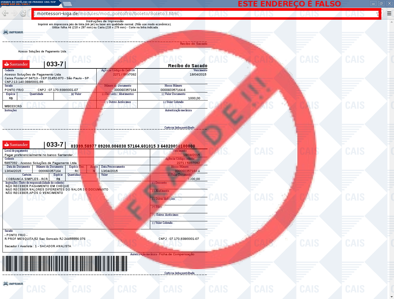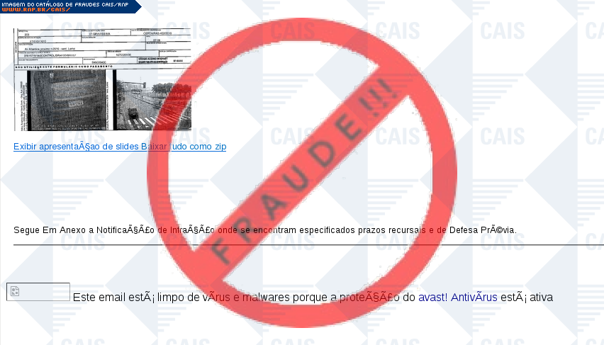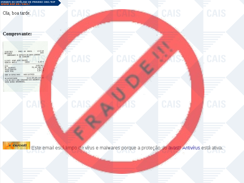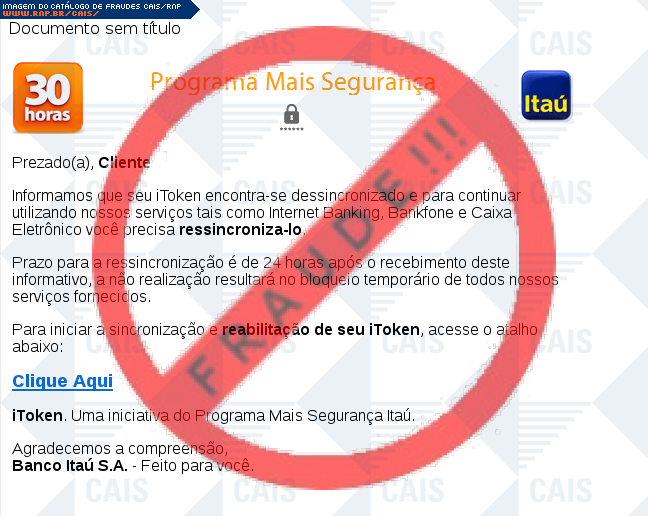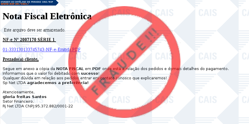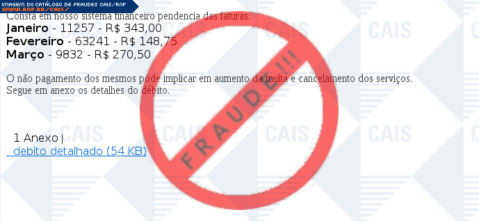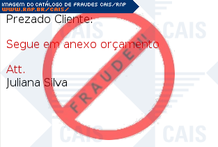 Esta página tem função informativa e educativa. Exibe uma coleção de imagens de phishing scam (fraudes eletrônicas) ou malware (código malicioso) veiculados por meio de spam (e-mail não-solicitado). Trata-se de conteúdo exemplificativo, não exaustivo, uma vez que não é possível contemplar todos os casos de fraudes existentes. Assim, caso você tenha conhecimento de um exemplar que não esteja aqui presente, isto não significa que não seja válido ou real. Inclusive incentivamos que você o envie para análise do CAIS para que, se for o caso, passe a integrar o nosso acervo.