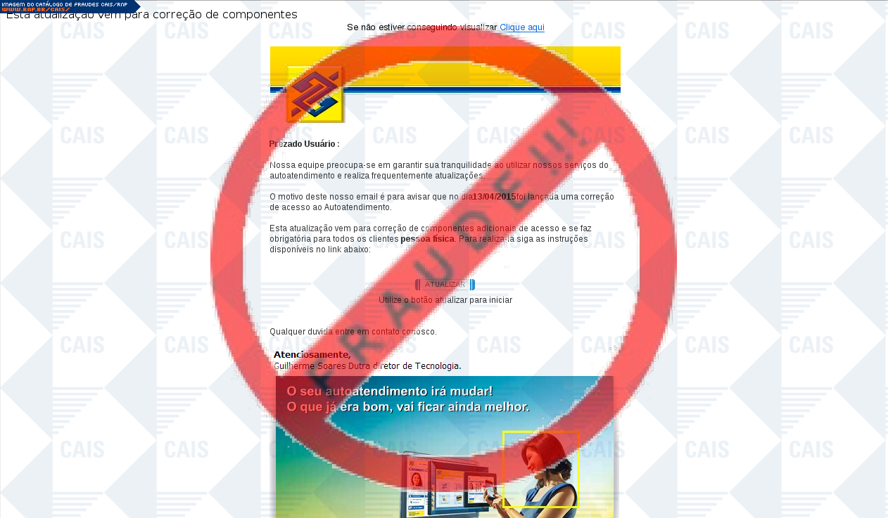 | comentário | O usuário recebe uma mensagem informando que o sistema do Banco do Brasil possui uma atualização de acesso do sistema de Autoatendimento para sua conta, no entanto a página é falsa destinada a roubar as informações bancárias do usuário. | |