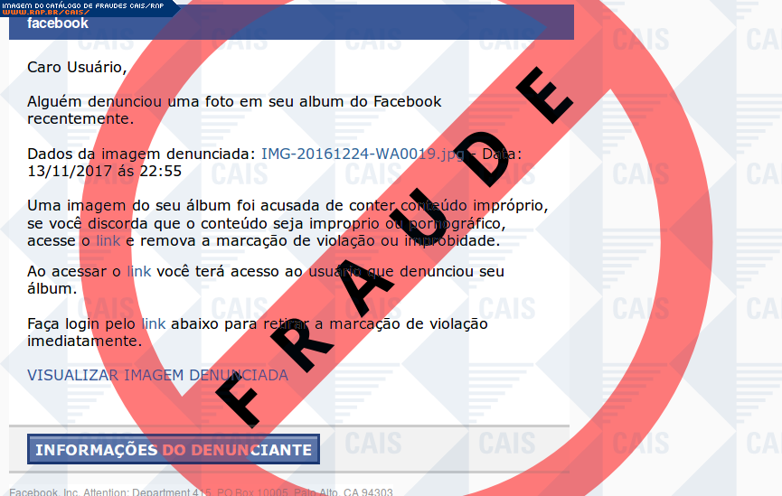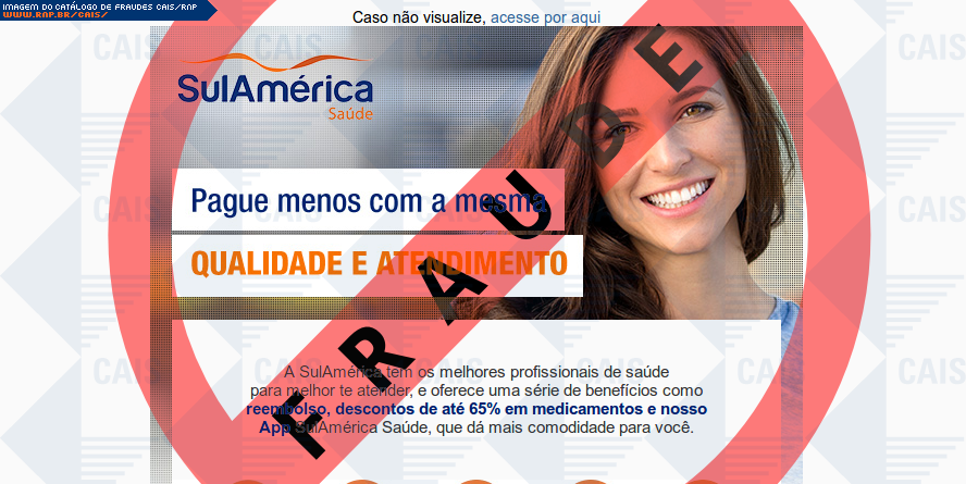 Esta página tem função informativa e educativa. Exibe uma coleção de imagens de phishing scam (fraudes eletrônicas) ou malware (código malicioso) veiculados por meio de spam (e-mail não-solicitado). Trata-se de conteúdo exemplificativo, não exaustivo, uma vez que não é possível contemplar todos os casos de fraudes existentes. Assim, caso você tenha conhecimento de um exemplar que não esteja aqui presente, isto não significa que não seja válido ou real. Inclusive incentivamos que você o envie para análise do CAIS para que, se for o caso, passe a integrar o nosso acervo.