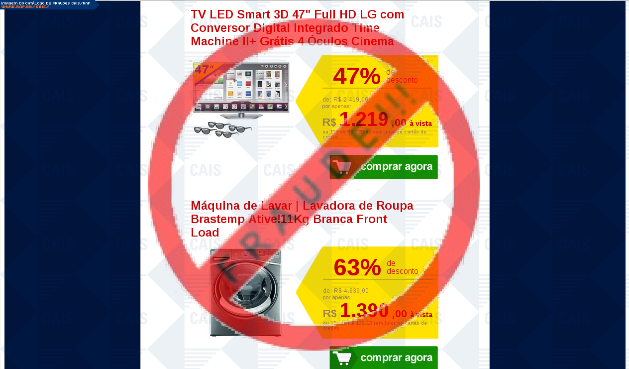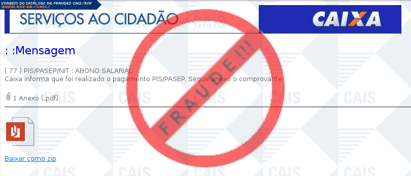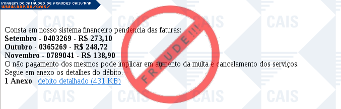 Esta página tem função informativa e educativa. Exibe uma coleção de imagens de phishing scam (fraudes eletrônicas) ou malware (código malicioso) veiculados por meio de spam (e-mail não-solicitado). Trata-se de conteúdo exemplificativo, não exaustivo, uma vez que não é possível contemplar todos os casos de fraudes existentes. Assim, caso você tenha conhecimento de um exemplar que não esteja aqui presente, isto não significa que não seja válido ou real. Inclusive incentivamos que você o envie para análise do CAIS para que, se for o caso, passe a integrar o nosso acervo.