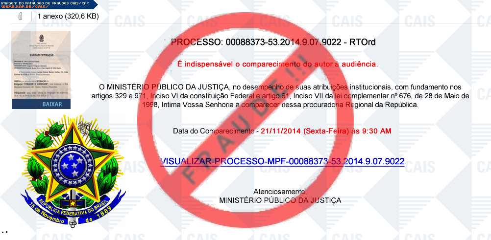 | comentário | A vítima recebe uma mensagem contendo uma intimação judicial, para comparecimento em audiência, disponível para download no entanto o arquivo gerado é malicioso destinado a roubar informações do usuário com o nome de Trojan/Win32.Generic. | |
