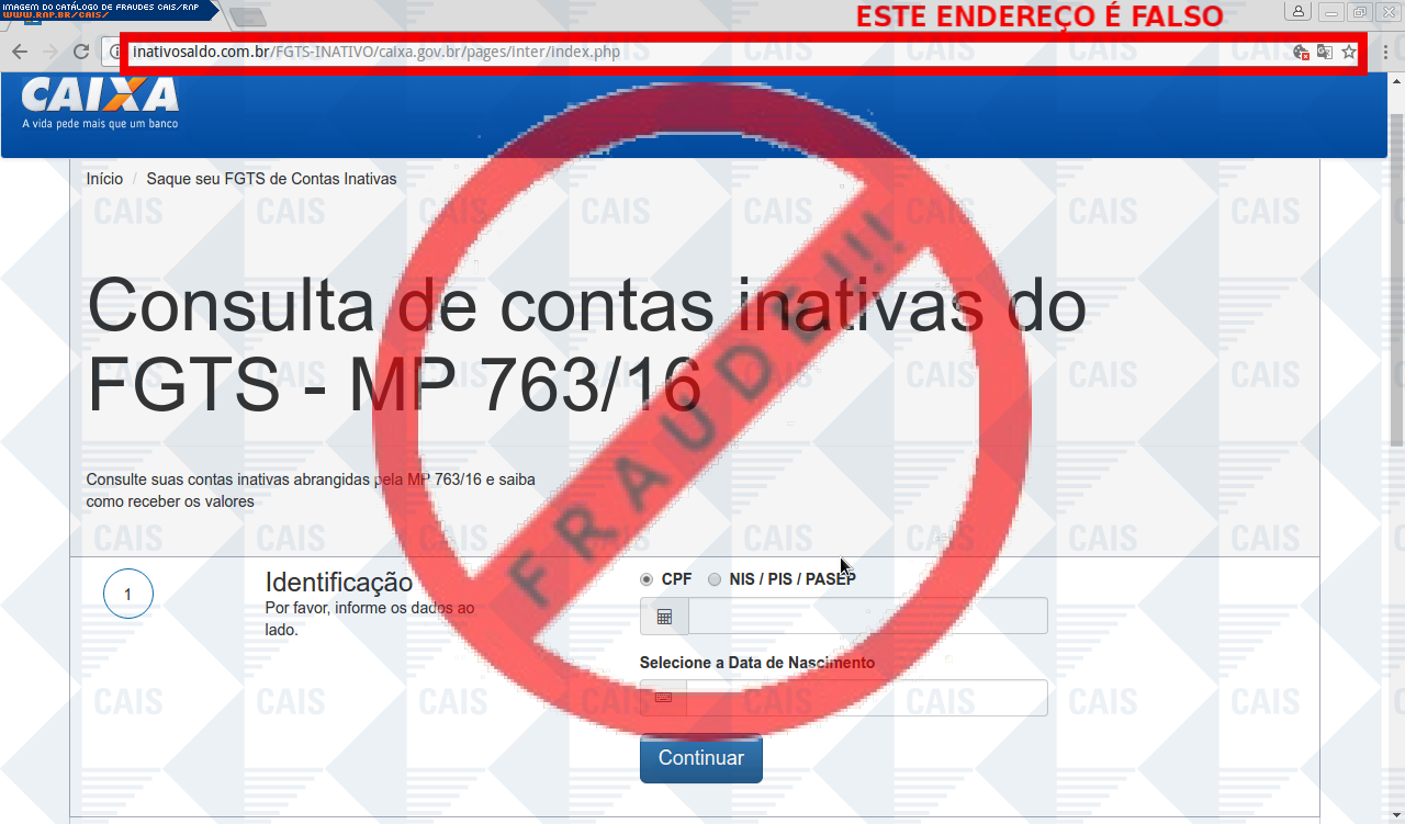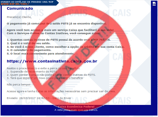 | comentário | A vítima recebe uma mensagem informando sobre valores de sua conta inativa do FGTS que esta disponível para saque e disponibiliza um link para consulta do extrato, no entanto a página é falsa criada para roubar informações da vítima. | |