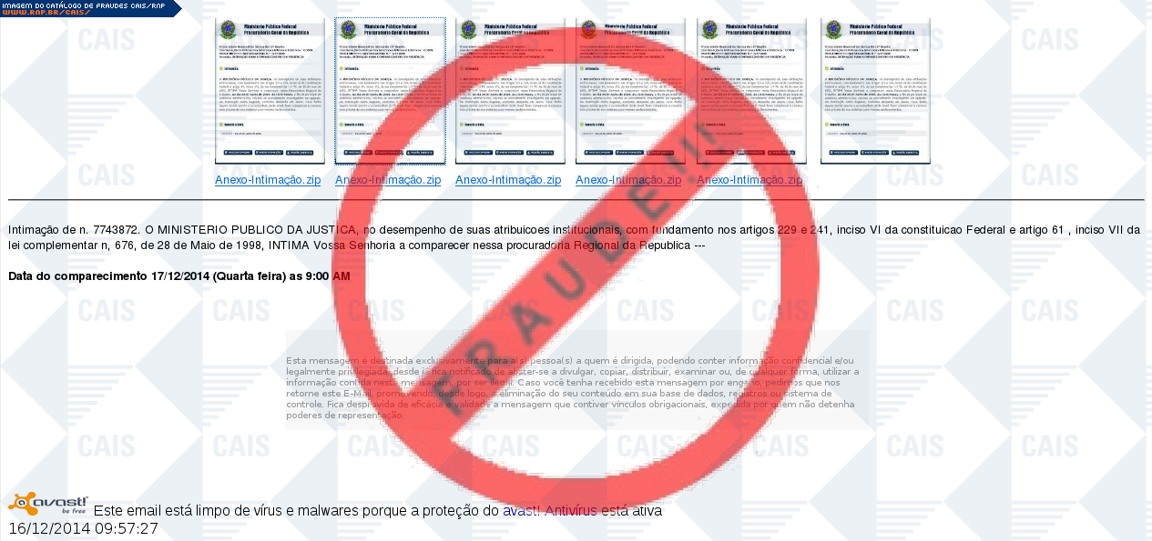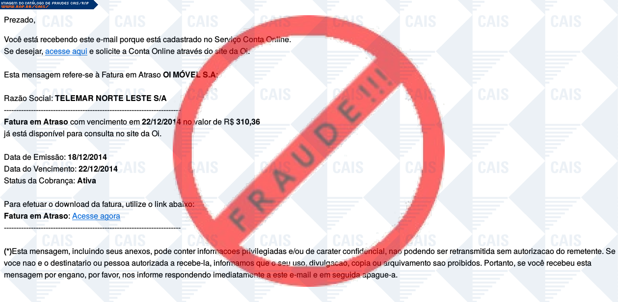 Esta página tem função informativa e educativa. Exibe uma coleção de imagens de phishing scam (fraudes eletrônicas) ou malware (código malicioso) veiculados por meio de spam (e-mail não-solicitado). Trata-se de conteúdo exemplificativo, não exaustivo, uma vez que não é possível contemplar todos os casos de fraudes existentes. Assim, caso você tenha conhecimento de um exemplar que não esteja aqui presente, isto não significa que não seja válido ou real. Inclusive incentivamos que você o envie para análise do CAIS para que, se for o caso, passe a integrar o nosso acervo.