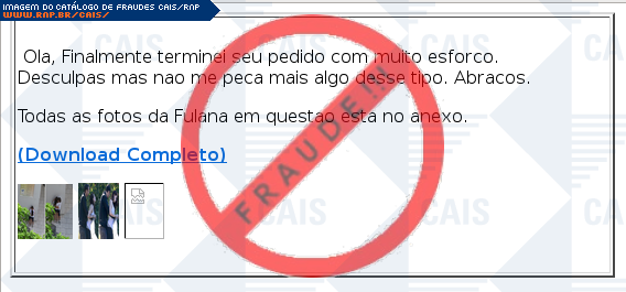 | comentário | O usuário recebe uma mensagem contendo fotos requisitadas disponíveis para download, no entanto o arquivo originado é malicioso criado para roubar informações da vítima e instalar outros arquivos fraudulentos com o nome de Trojan/Win32.Banload. | |