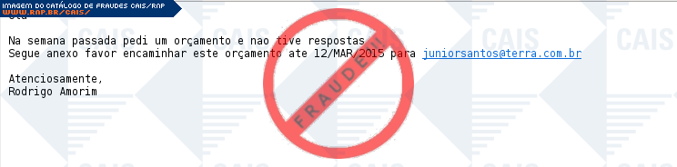 | comentário | O usuário recebe uma mensagem contendo um orçamento disponível em anexo, no entanto o arquivo originado é malicioso criado para roubar informações da vítima e instalar outros arquivos fraudulentos com o nome de Trojan/Win32.Banker. | |