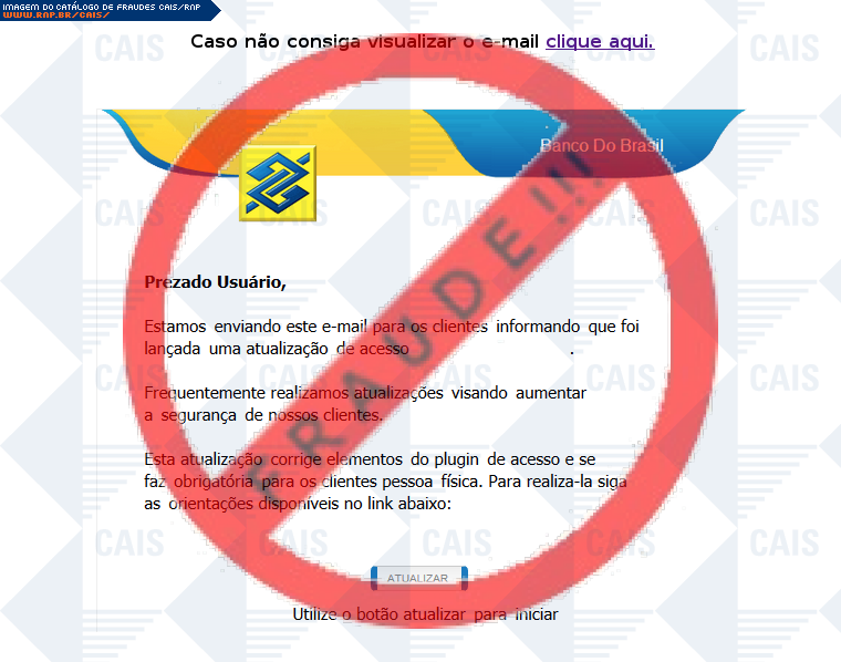 Esta página tem função informativa e educativa. Exibe uma coleção de imagens de phishing scam (fraudes eletrônicas) ou malware (código malicioso) veiculados por meio de spam (e-mail não-solicitado). Trata-se de conteúdo exemplificativo, não exaustivo, uma vez que não é possível contemplar todos os casos de fraudes existentes. Assim, caso você tenha conhecimento de um exemplar que não esteja aqui presente, isto não significa que não seja válido ou real. Inclusive incentivamos que você o envie para análise do CAIS para que, se for o caso, passe a integrar o nosso acervo.