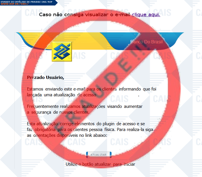 | comentário | A vítima recebe uma mensagem dizendo que precisa atualizar sua conta do Banco do Brasil através de um link passado no email. Entretanto, o link leva a uma página falsa que tenta roubar as informações bancárias da vítima. | |
