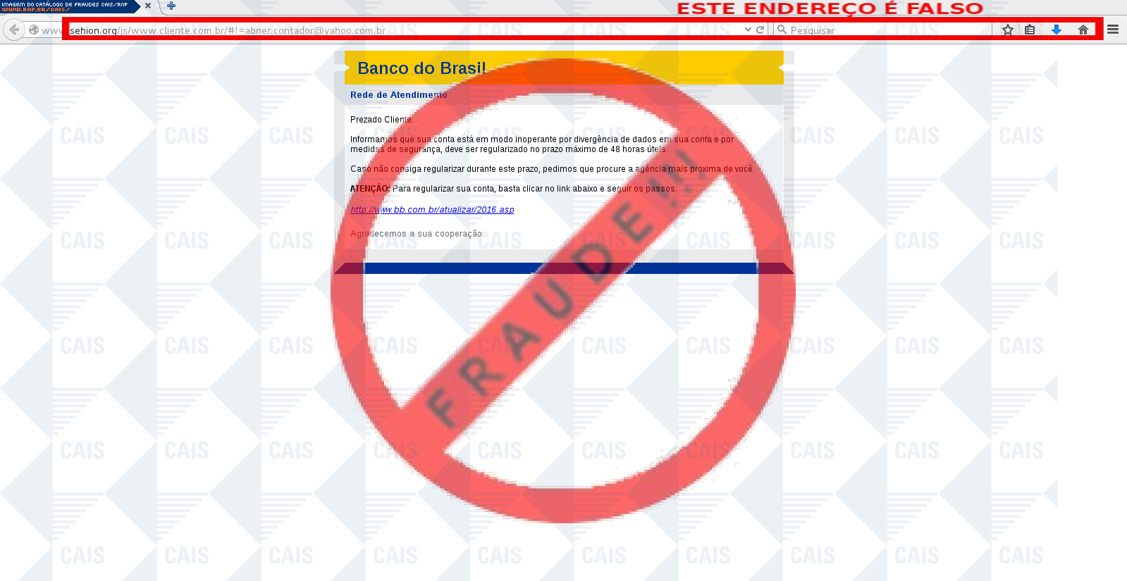 | comentário | A vítima recebe um email dizendo que sua conta do Banco do Brasil está inoperante por divergência de dados da conta e que deve ser atualizada em até 48 horas. Entretanto, o link na mensagem leva a uma página falsa que tenta roubar informações bancárias da... (leia mais) | |