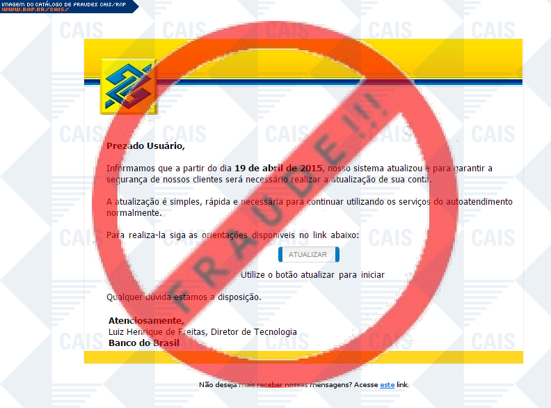 Esta página tem função informativa e educativa. Exibe uma coleção de imagens de phishing scam (fraudes eletrônicas) ou malware (código malicioso) veiculados por meio de spam (e-mail não-solicitado). Trata-se de conteúdo exemplificativo, não exaustivo, uma vez que não é possível contemplar todos os casos de fraudes existentes. Assim, caso você tenha conhecimento de um exemplar que não esteja aqui presente, isto não significa que não seja válido ou real. Inclusive incentivamos que você o envie para análise do CAIS para que, se for o caso, passe a integrar o nosso acervo.