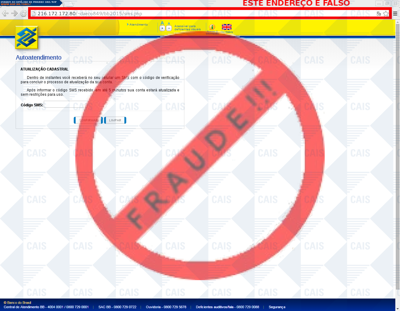 | comentário | A vítima recebe uma mensagem informando que sua conta no Banco do Brasil expirou sendo necessário atualizar a conta por motivos de segurança e para evitar o bloqueio, no entanto a página é falsa destinada a roubar as informações bancárias do usuário. | |