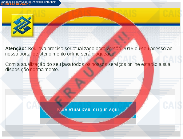 | comentário | A vítima recebe um email informando que precisa realizar uma atualização do java, ou seu acesso ao portal online será bloqueado. Entretanto o site de atualização é na verdade uma página de phishing com o intuito de roubar informações. | |
