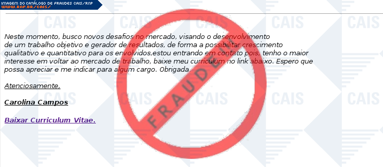 | comentário | O usuário recebe uma mensagem contendo um currículo disponível para download, no entanto o arquivo originado é malicioso criado para roubar informações da vítima e instalar outros arquivos fraudulentos com o nome de Trojan.JS.Agent.LES. | |