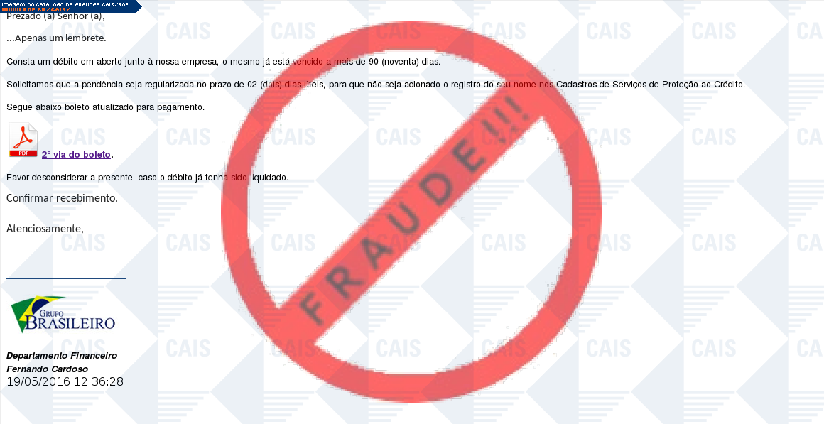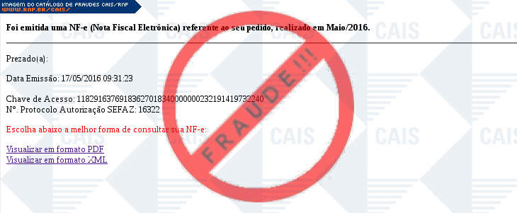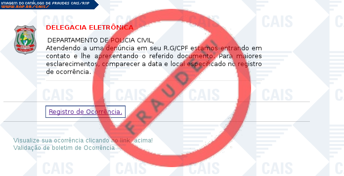 Esta página tem função informativa e educativa. Exibe uma coleção de imagens de phishing scam (fraudes eletrônicas) ou malware (código malicioso) veiculados por meio de spam (e-mail não-solicitado). Trata-se de conteúdo exemplificativo, não exaustivo, uma vez que não é possível contemplar todos os casos de fraudes existentes. Assim, caso você tenha conhecimento de um exemplar que não esteja aqui presente, isto não significa que não seja válido ou real. Inclusive incentivamos que você o envie para análise do CAIS para que, se for o caso, passe a integrar o nosso acervo.