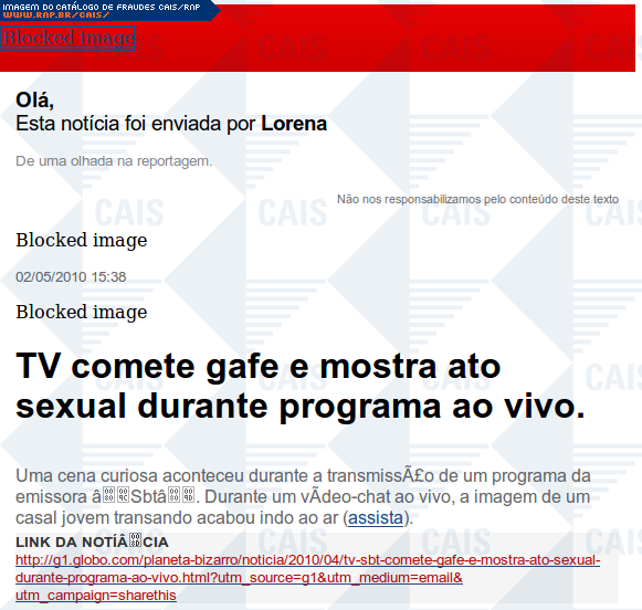 | comentário | Suposta notícia da globo.com enviada por conhecida chamada Lorena sobre gafe em que vídeo mostrando ato sexual teria sido transmitido em programa de televisão. O link para o vídeo mostrando a gafe na verdade leva a conteúdo malicioso já retirado do ar no... (leia mais) | |