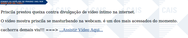 | comentário | Mensagem comentando sobre suposto vídeo íntimo da Priscila do Big Brother Braisl 10 e fornecendo um link que levaria ao vídeo em questão. Tal link direciona a vítima para um malware identificado como TR/VB.Downloader.Gen (AntiVir). | |
