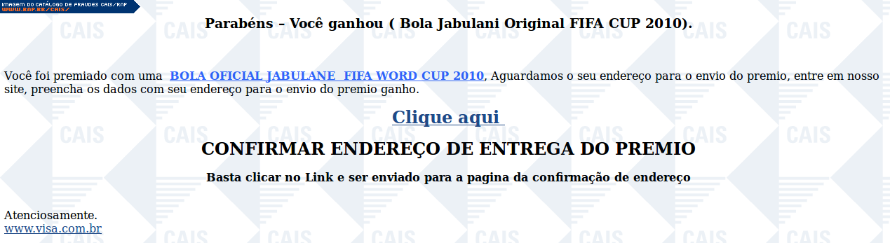 | comentário | Mensagem falsa se passando pela Visa anunciando que a vítima foi premiada com uma bola oficial da Copa do Mundo 2010, a Jabulani. Para receber o suposto prêmio, a vítima teria que confirmar o endereço de entrega através de um link fornecido. Tal link leva... (leia mais) | |