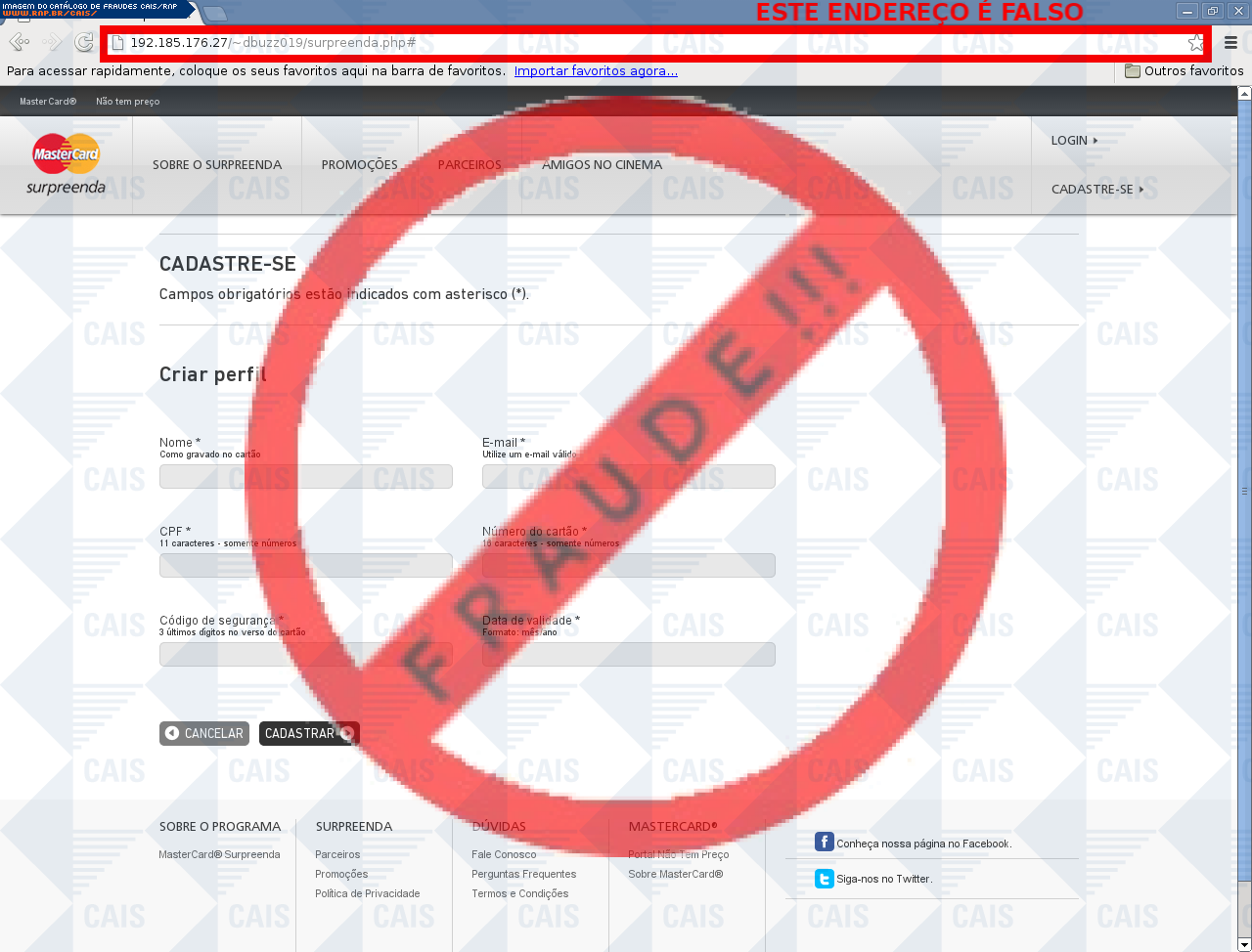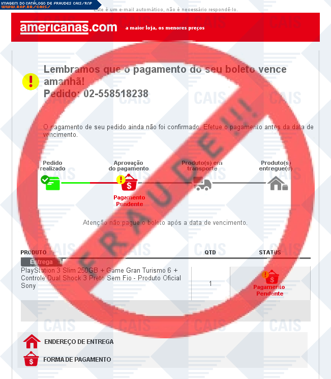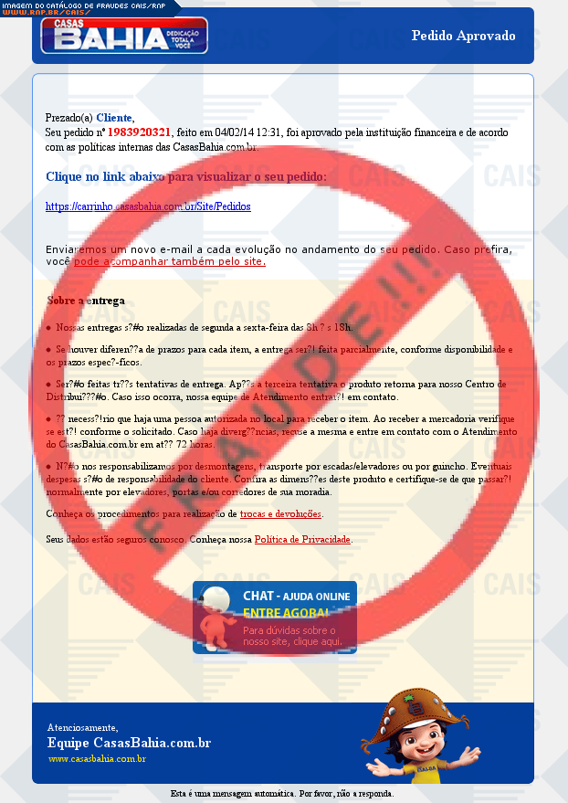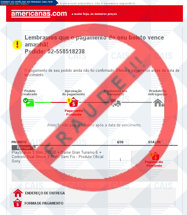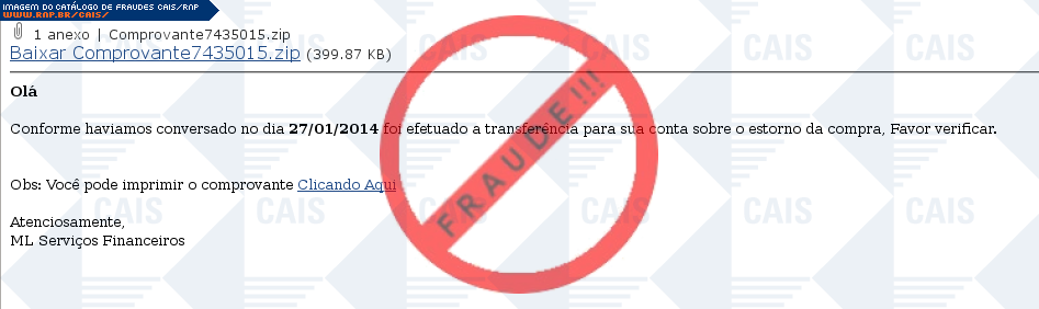 Esta página tem função informativa e educativa. Exibe uma coleção de imagens de phishing scam (fraudes eletrônicas) ou malware (código malicioso) veiculados por meio de spam (e-mail não-solicitado). Trata-se de conteúdo exemplificativo, não exaustivo, uma vez que não é possível contemplar todos os casos de fraudes existentes. Assim, caso você tenha conhecimento de um exemplar que não esteja aqui presente, isto não significa que não seja válido ou real. Inclusive incentivamos que você o envie para análise do CAIS para que, se for o caso, passe a integrar o nosso acervo.