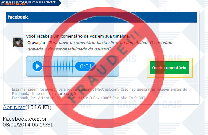 | comentário | A vítima recebe uma mensagem, informando que recebeu um comentário de voz em sua timeline, e para ouvir o comentário basta clicar no link. Mas ao clicar no link, inicia-se o download de um malware. | |