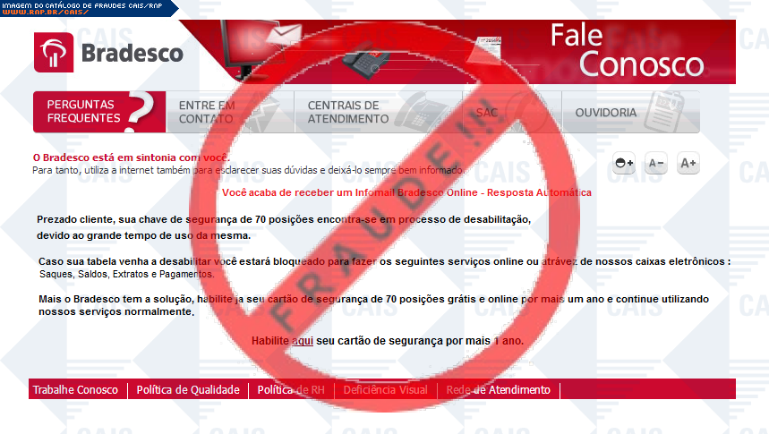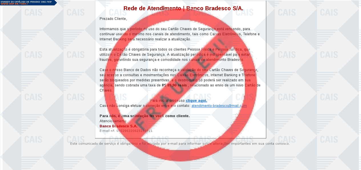 | comentário | O usuário recebe um e-mail informando que sua chave de segurança da conta do banco Bradesco está em processo de desabilitação sendo necessário realizar uma atualização no link disponibilizado, entretanto a página fornecida é falsa criada para roubar os dados... (leia mais) | |