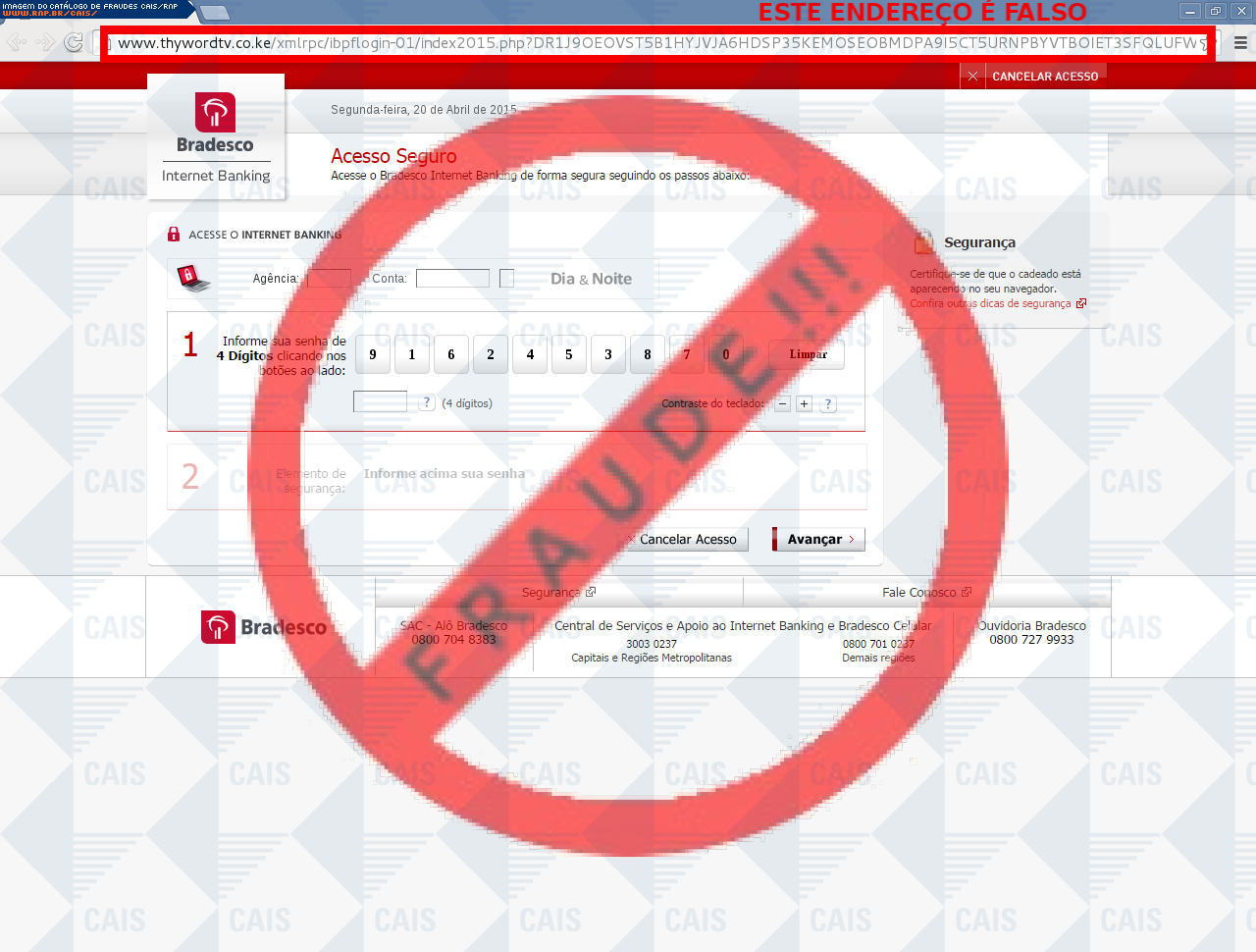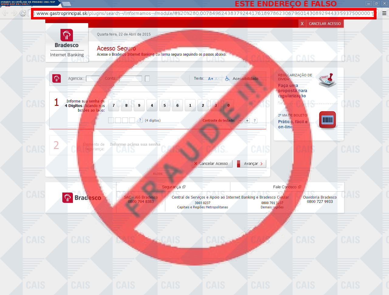 Esta página tem função informativa e educativa. Exibe uma coleção de imagens de phishing scam (fraudes eletrônicas) ou malware (código malicioso) veiculados por meio de spam (e-mail não-solicitado). Trata-se de conteúdo exemplificativo, não exaustivo, uma vez que não é possível contemplar todos os casos de fraudes existentes. Assim, caso você tenha conhecimento de um exemplar que não esteja aqui presente, isto não significa que não seja válido ou real. Inclusive incentivamos que você o envie para análise do CAIS para que, se for o caso, passe a integrar o nosso acervo.